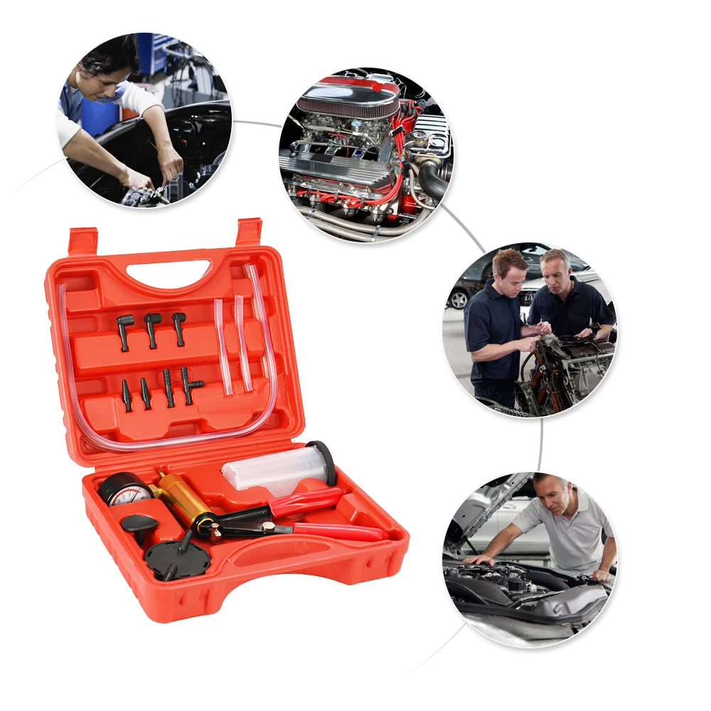 Этот профессиональный вакуумный насос используется для тестирования различных основных настроек и операций транспортного средства. Он может проверить вакуумные и управляемые давлением автомобильные компоненты. В комплект входит резервуар тормозной жидкости для кровотечения.
