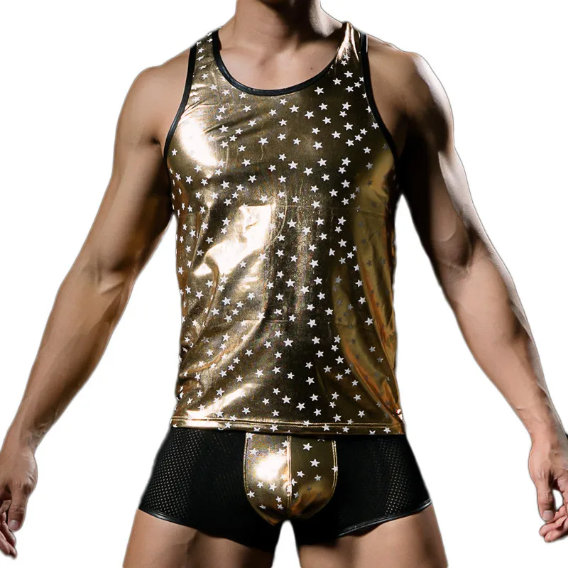Блестящая бронзовая сексуальное мужское нижнее белье Искусственная кожа Тонкий жилет Топ без рукавов вечерние Crazy для ночных клубов, шорты-боксеры мужские комплект одежды