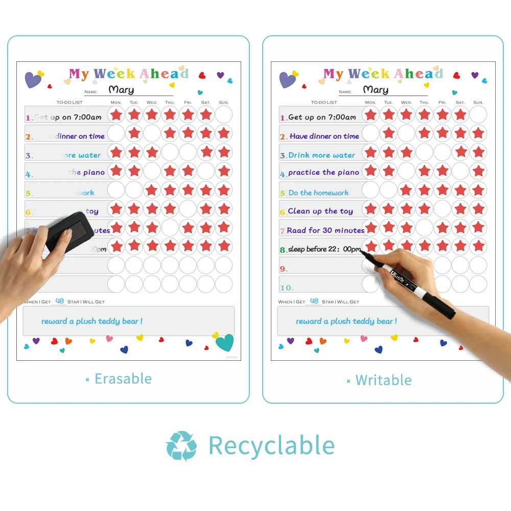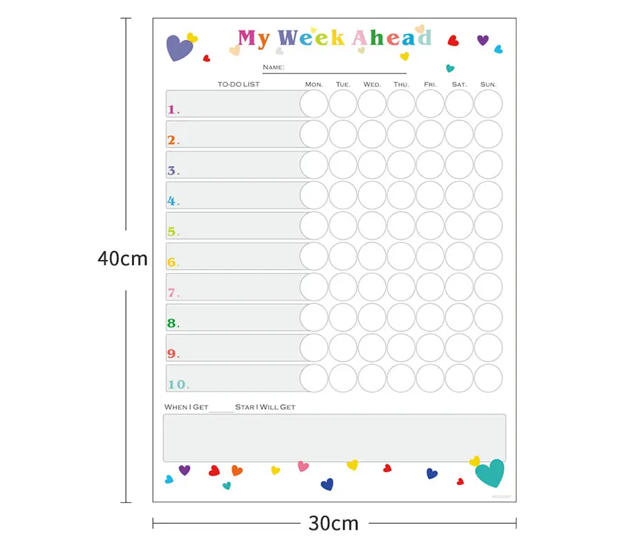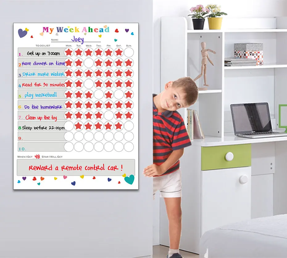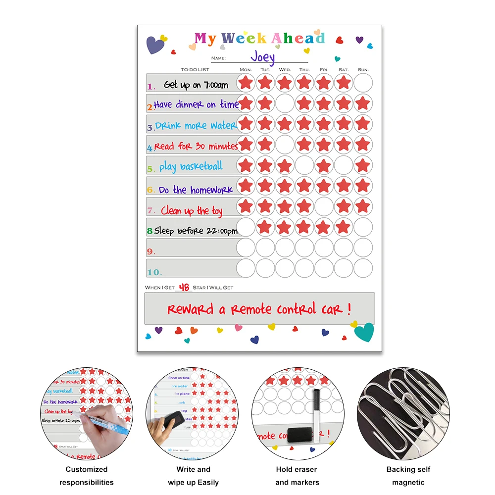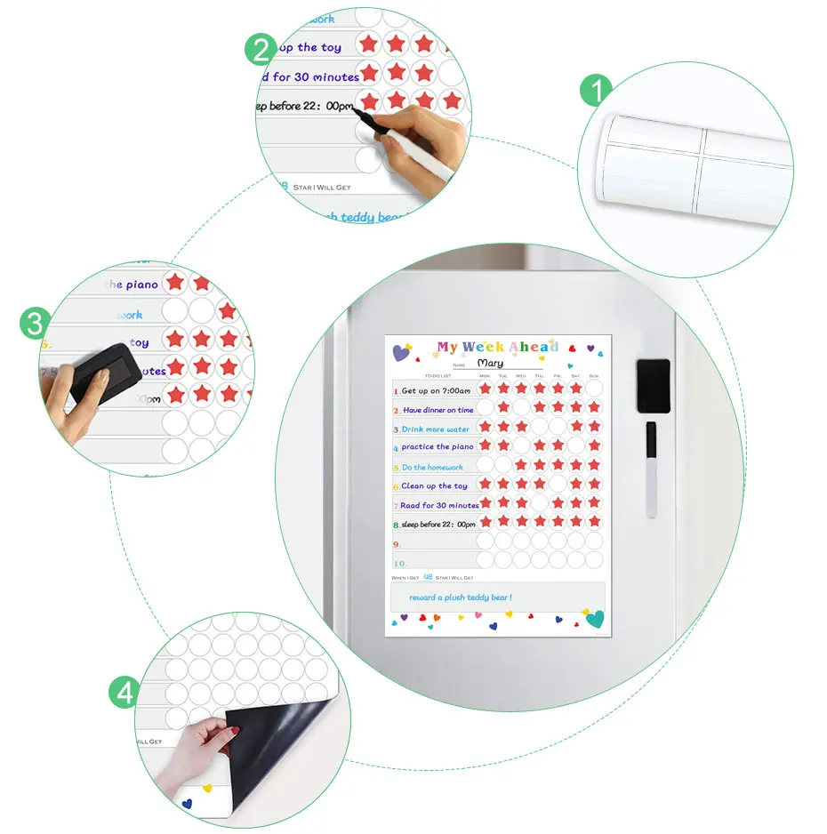 Описание: детские chore chart, магнитное расписание, to-do list Материал: магнитный порошок, резина, HD печать, ПЭТ пленка. Особенности: самомагнитный, гибкий, поддержка письма, портативный, прочный. Размер: 40*30 см Толщина: 0,4 мм Стираемость: сухая протирать, долговечная яркая и легко очищенная. Применение: нанесите на поверхность из железа, например, на холодильник и так далее.