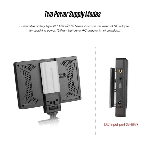 Двойная система электропитания (литиевая батарея серии NP-F или адаптер переменного тока). Стандартная удлиненная вытяжка, чтобы избежать помех на светильник.