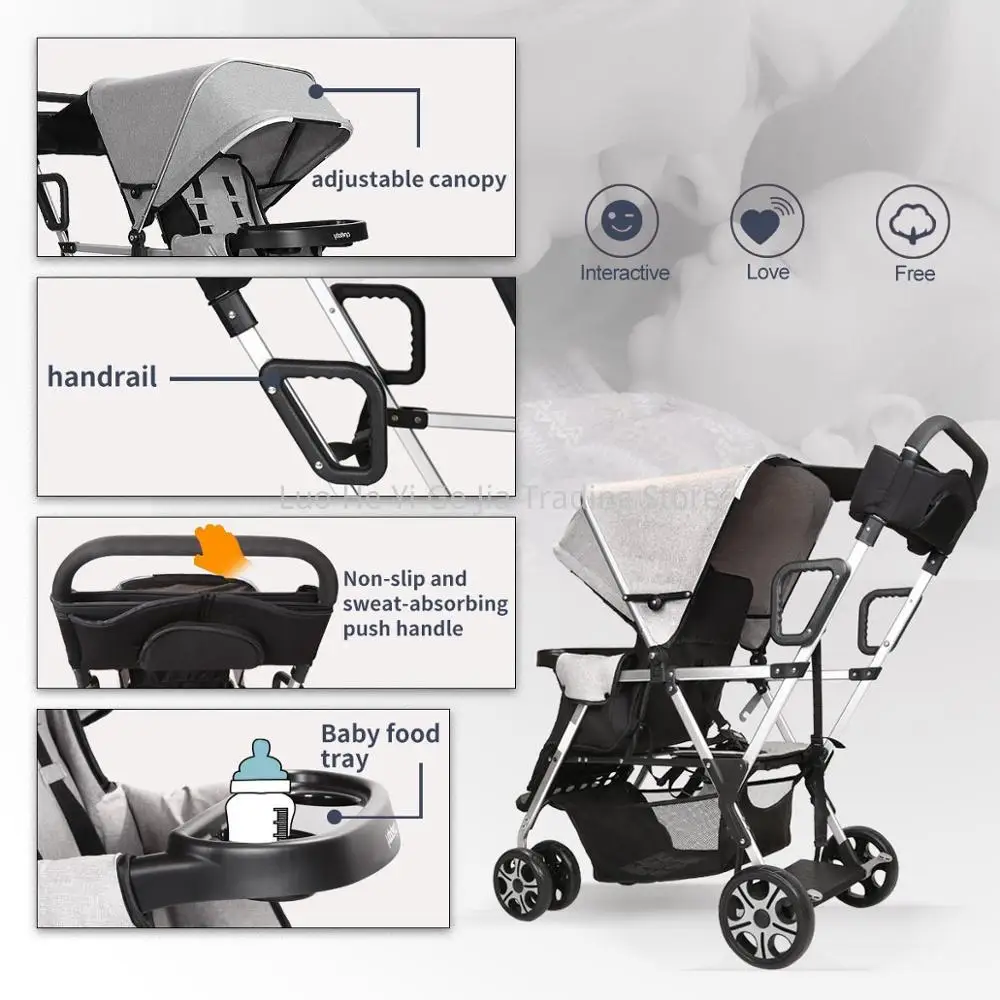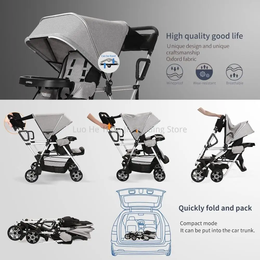 Когда вы доставляете двух детей в продуктовый магазин или тематический парк или совершаете дневную поездку куда-то, вы не можете ожидать, что они будут ходить весь день. Заднее сидение тандемной коляски дает Детям старшего возраста место, чтобы иметь место, если они устали после прогулки на большом расстоянии. Также здесь есть задняя платформа, на которой малыши могут стоять, что заставляет их чувствовать себя взрослыми. Маленький ребенок всегда может сидеть в вертикальном положении или полуоткидываться на переднем сиденье. Пожилой ребенок может стоять или сидеть на заднем сиденье. Высококачественная Экологически чистая ткань и нетоксичный здоровый пластик (ребенок укусил его во рту, не беспокоясь о токсичных веществах); Чрезвычайно стабильная оправа; Антикоррозийная и сверхпрочная трубка из алюминиевого сплава; система быстрого торможения; Безопасность детской коляски защищает вашего ребенка во всех аспектах. Большая корзина для хранения грузов (удобно разместить сумки для подгузников, игрушки или зонтик, когда вы выходите на прогулку с вашими двумя детьми); вращающийся на 145 градусов навес и навес заднего сиденья предотвращают попадание солнечных лучей и пыли. Функциональные родительские органайзеры помогают разместить кошелек, чашку, мобильный телефон. Лоток для коляски можно использовать в качестве тарелки для закусок. Уникальный дизайн, ребенок старшего возраста может стоять на задней панели самостоятельно, что заставляет их чувствовать себя взрослыми. Или они могут сидеть на заднем сидении, когда они устали в ходьбе. Они могут лицом вперед или лицом назад, когда они стоят.