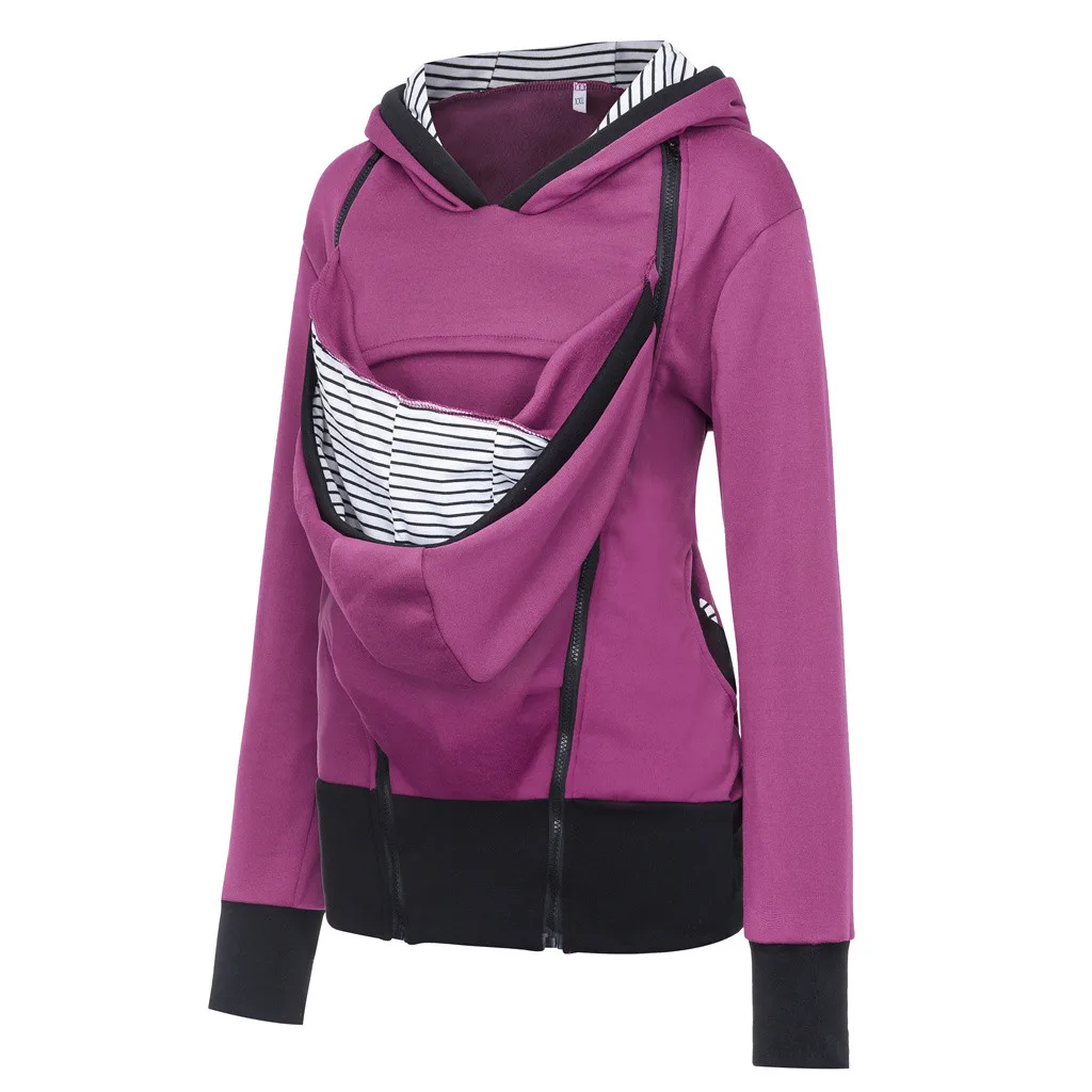 Women Maternity Striped Baby Pouch Carrier Hoodie Kangaroo Zipper Pregnancy Coat