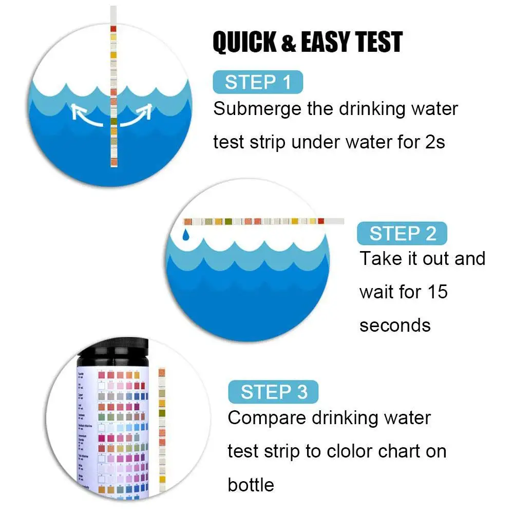 3. Простота использования: окуните тестовую бумагу для питьевой воды в воду на 5 секунд, держите ее на воздухе около 30 секунд, А затем Отрегулируйте цвет обратной стороны бутылки, чтобы получить показания. Даже новичкам тест-полоски для питьевой воды просты в использовании.