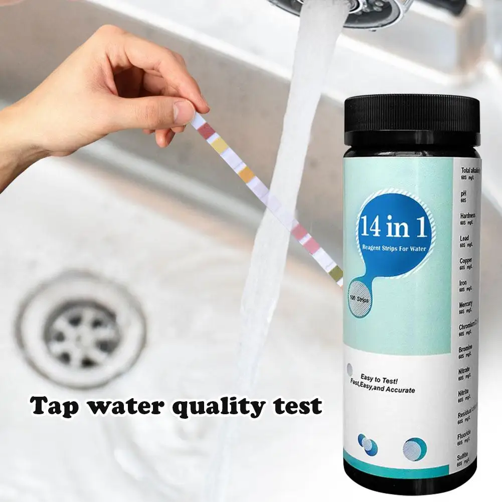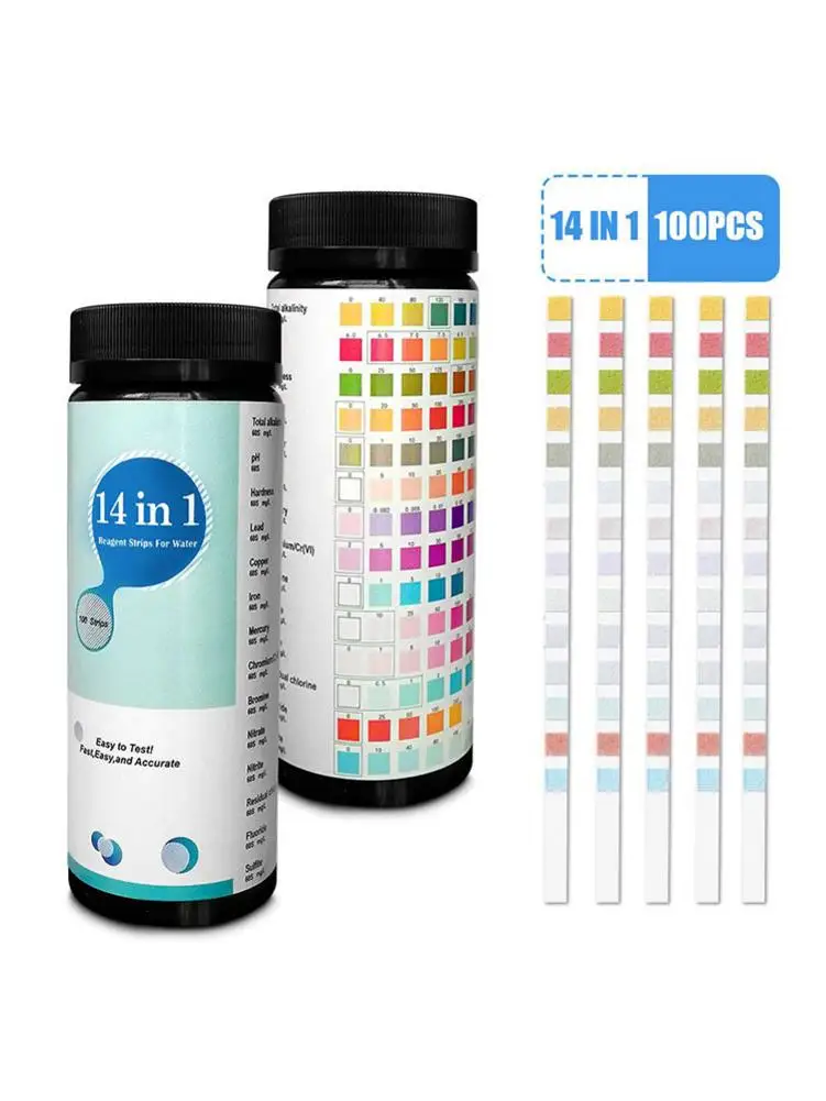 Обновленная тест-полоска 14 в 1 для питьевой воды, тест качества воды и водопроводной воды, простой и быстрый тест на твердость, pH, бром, нитрат и т. д., 1 упаковка (100 шт.)Особенность: