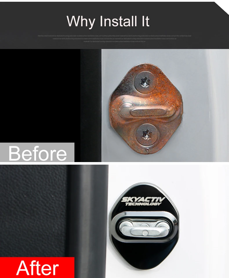 1. Легко установить 2. Материал: нержавеющая сталь 3. Посылка: 4 шт. в комплекте 4.для предотвращения ржавчины дверного замка, декорирования и украшения 5. Перед покупкой, пожалуйста, проверьте форму вашего автомобильного замка!