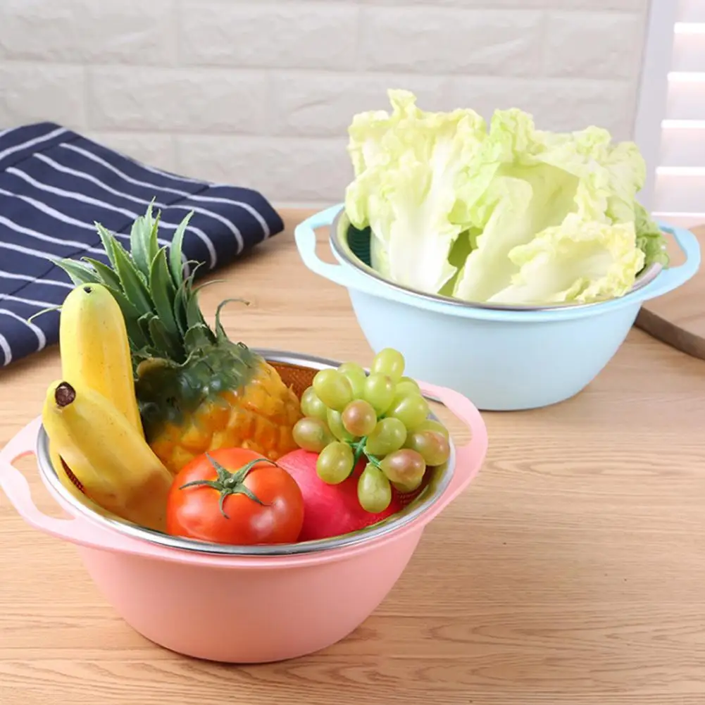 2. Широкое использование: набор сливных корзин не только подходит для очистки фруктов и овощей на кухне, но также может использоваться для хранения фруктов, что является многоцелевой корзиной.