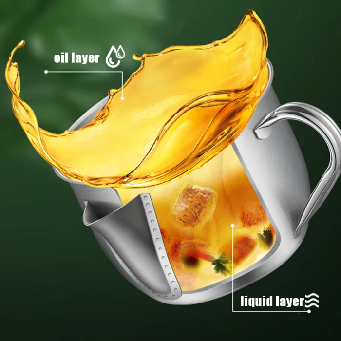 4. Двусторонняя конструкция выхода, верхнее отверстие для протачивания супа с маслом, нижнее отверстие вытекать суп без масла.