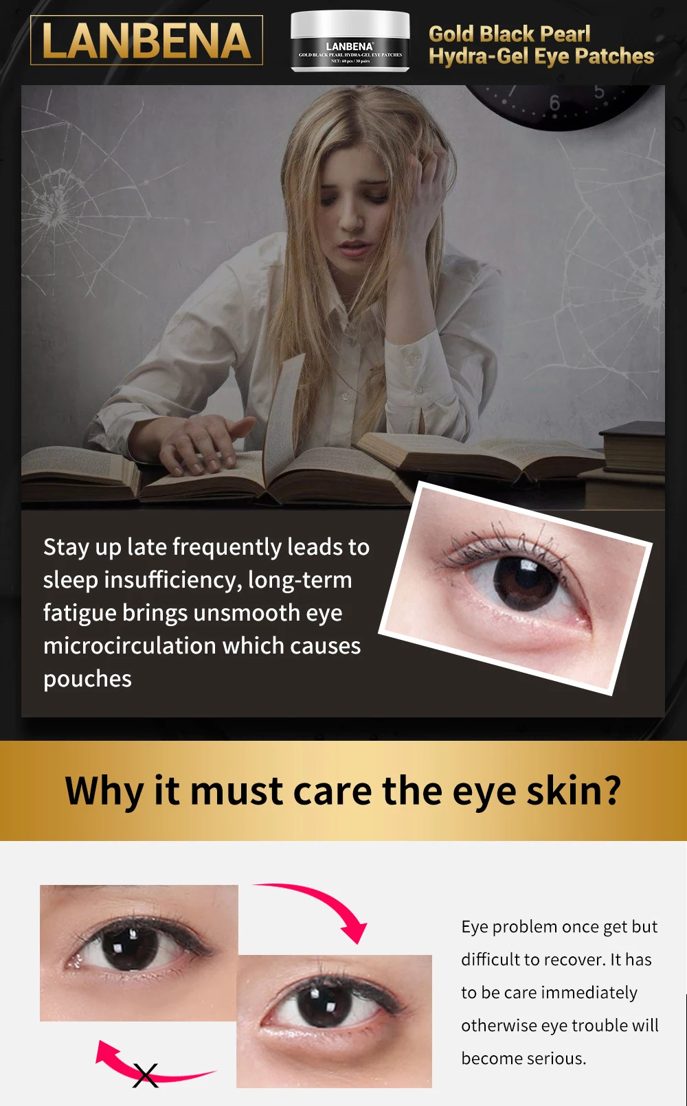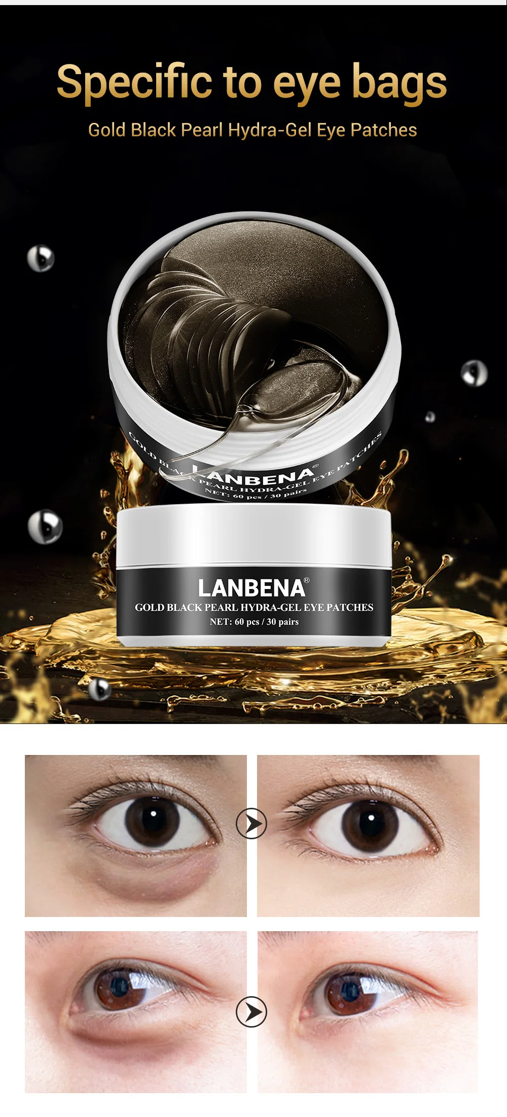 LANBENA Face Mask Gold Black Pearl Collagen Eye Patch Gel Face Care Repairing Wrinkle Lighten Skin Erase Eye Bag Eye Care 60pcs