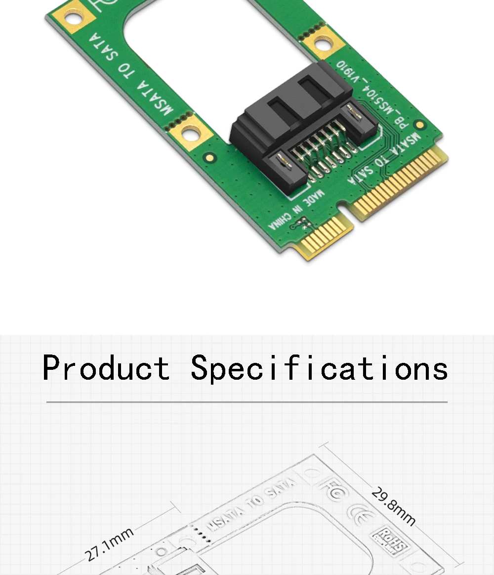 Расширьте разъем mSATA для материнской платы на разъем SATA 7PIN. Плата адаптера подключает сигнал только от разъема MSATA к разъему SATA 7PIN. Поэтому Адаптерная карта не должна приводиться в движение. Если вы не распознаете жесткий диск, пожалуйста, проверьте, является ли интерфейс MINI SATA, карта в основном не является ошибкой, Пожалуйста, знайте. Эта карта поддерживает половинную высоту и полную высоту. Если вы хотите использовать половинную высоту, просто обрежьте линию V-CUT в середине печатной платы.