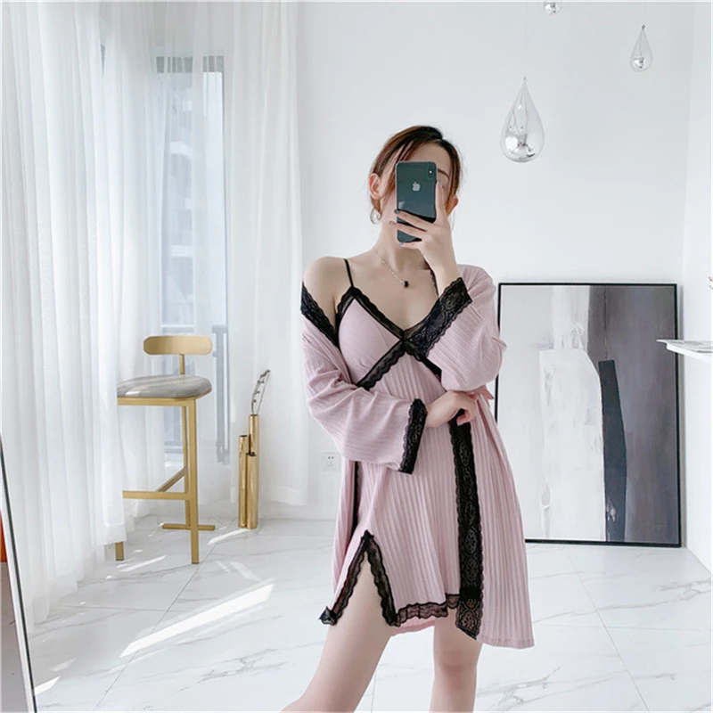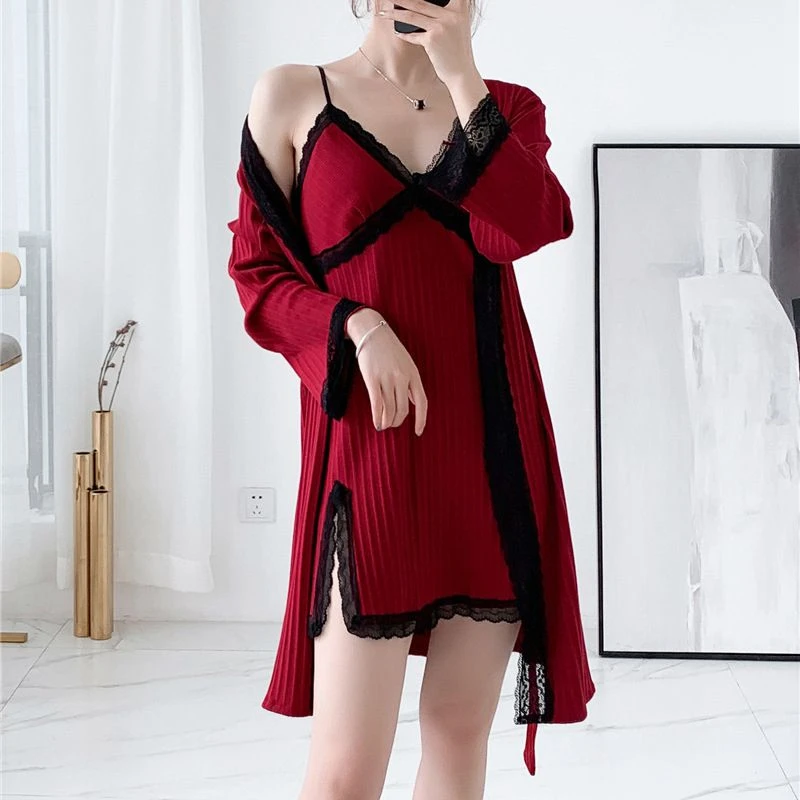 Отзывы о nightgown robe two-piece long-sleeved home service autumn winter cotton pajamas women bride lace sexy wine red sling strap | Женская