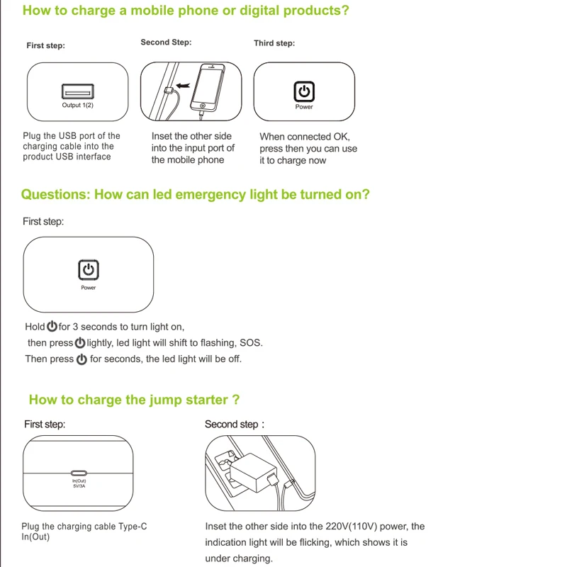 Особенности стартера автомобиля: 1. Небольшой размер, светильник вес, большая емкость, сильная мощность. 2. Использование литий-ионных полимерных аккумуляторов высокой мощности, поддержка быстрой зарядки, низкий саморазряд, циклы зарядки и разряда, 3. Защита от заряда, защита от зарядки интеллектуальных аккумуляторов, двойная защита, защита от короткого замыкания, эффективное предотвращение обратного тока, повреждение аккумулятора. 4. Поддержка для детей возрастом от 12V автомобильных экстренных стартов бренд мобильные телефоны, Оборудование для PSP, MP3 или MP4 и другие продукты источника питания. 5. Функция фонарика, поддержка 3 видов режимов освещения с освещением, стробоскопом, функцией SOS. 6. Оснащен usb-портами 5 в 2 А, которые могут быстро заряжать. 7. Энергосберегающая конструкция, эффективно предотвращает потери тока. Основная функция автомобильного скачка: · Это умный внешний аккумулятор и многофункциональный автомобильный стартер · Скачок стартера-для запуска битого аккумулятора бензинового автомобиля 12 В всего за несколько секунд. Он может запускать аккумулятор транспортного средства 6 раз при полной зарядке. Когда вы путешествуете в небольшом месте, и ваш автомобильный аккумулятор не работает, вы можете использовать этот автомобильный стартер для запуска вашего автомобиля. · Внешний аккумулятор для зарядки портативных электронных устройств, таких как мобильные смартфоны, портативная игровая система, цифровые камеры, видеокамеры, bluetooth-гарнитуры, портативные gps-устройства, И любые другие электронные устройства с питанием 5 в постоянного тока. · SOS светильник-если вы находитесь на открытом воздухе в кемпинге и окажетесь в чрезвычайной ситуации, вы можете использовать сигнальный светильник SOS стробоскоп для привлечения внимания · Светодиодный светильник-использовать как фонарь со встроенной функцией светодиодный фонарь светильник