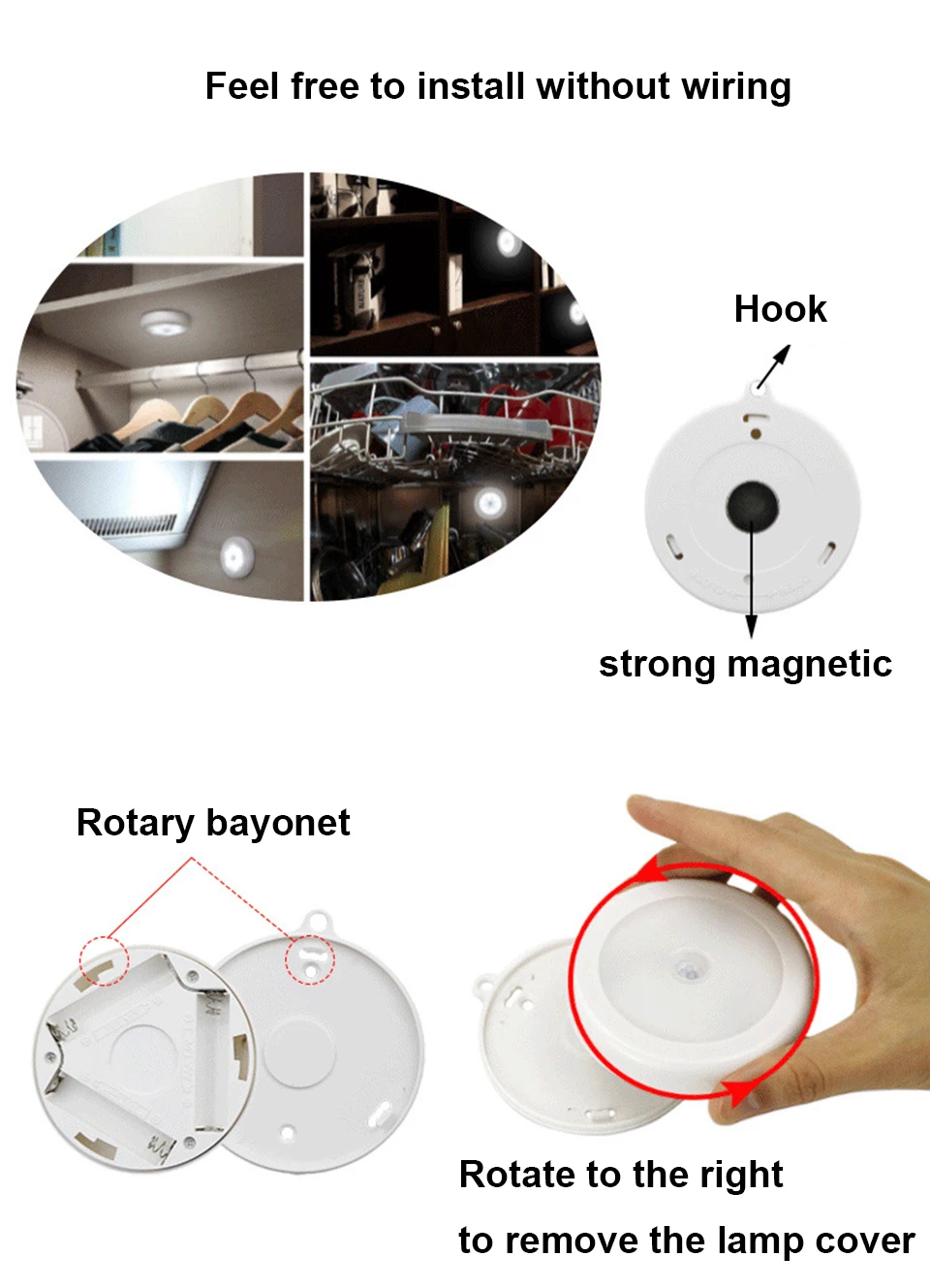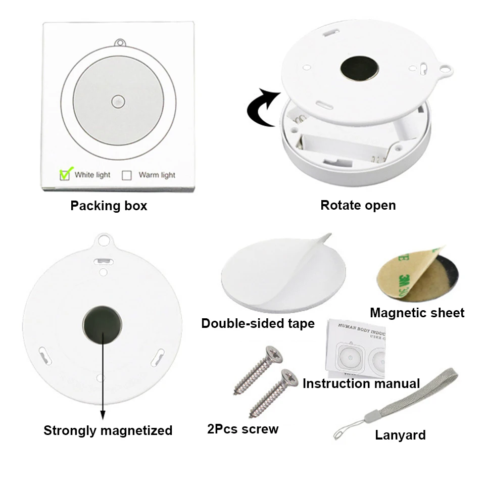 Описание: применения: Применение: спальня, детская комната, гостиная, шкаф, шкаф, коридор, мастерская, подвал, гараж, лестница, нефтяные склады, крыша, дверь, гаражные входы и другие места. Параметры продукта: 1. Тип: датчик движения ночного освещения 2. Источник питания: 3 батарейки AAA (не входят в комплект) 3. Мощность: 3 Вт 4. Цвет света: 3000K теплый белый/6500K дневной свет белый 5. Чувствительный угол: 100 градусов 6. Супер чувствительность: Расстояние 1-3 метра 7. Работа: температура окружающей среды <40 °C, окружающая Яркость <10 люкс. Автоматическое включение при обнаружении людей, прибывающих ночью или в темное место. Открытый светодиодный источник света, когда тело человека покидает зонд 15S, закрывает светодиодный источник света. 8. Количество светодиодов: 6 светодиодов 9: срок службы светодиодов: 50,000 часов или более 10. Светоизлучающее время задержки вымирания: 10-15 секунд 11. Рейтинг IP: IP50 12. Материал корпуса: АБС-пластик В комплект входит: 1 * светодиодный ночник с датчиком движения 1 * подвесной слинг Двусторонняя клейкая лента 1*3 м 2 * винта 1 * Руководство пользователя