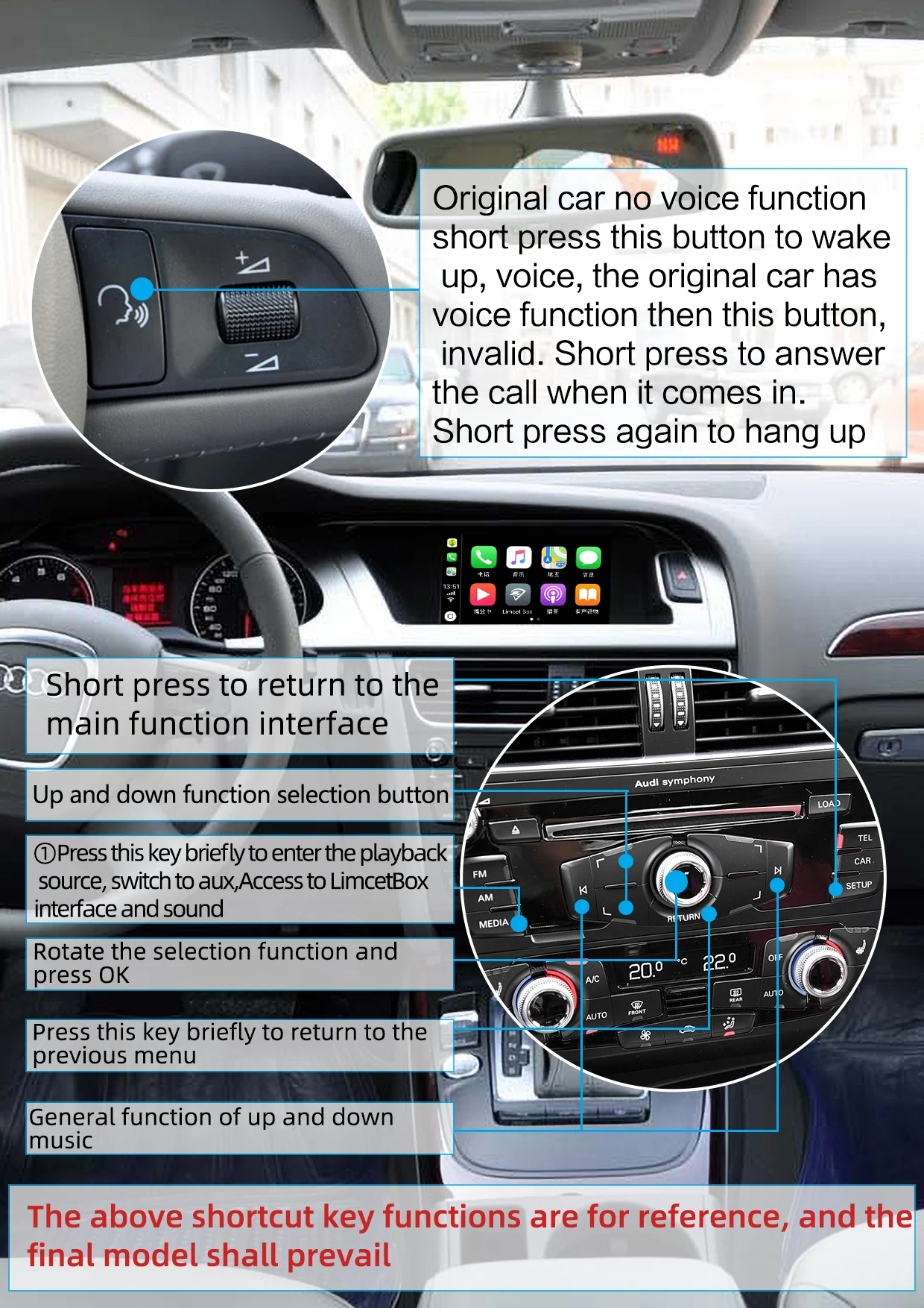 Примечания: покупатели, пожалуйста, сообщите нам модель вашего автомобиля и год его производства, или сделайте фотографии панели управления автомобилем и экран дисплея продавцу, прежде чем сделать заказ. Поддерживает модели AUDI, все модели 2006-2009 функций 1. Работает с беспроводным Apple CarPlay, сопряжение через Bluetooth, передача через Wi-Fi. 2. Также работает с проводным CarPlay, сначала выключите Wi-Fi, подключите через кабель освещения (проводной Держите ваш телефон заряжен одновременно) 3. Зеркальное отображение на Android-Link для телефонов Android (ссылка для загрузки) 4. Приложения для gps-навигации, Google Maps, Waze и Apple Maps доступны, информация о реальном времени 5. Музыкальные яблоки Spotify,Apple Music, Amazon и т. Д. Аудио через фабрику Audi media, текст на дисплее для некоторых приложений. 6. Голосовое управление, говоря: "Эй, Сири..." 7. Aftermarket фронтальная/задняя/360 Входная камера. (Поддерживаются динамические линии наведения) 8. USB флеш-накопитель для воспроизведения музыки и видео с помощью подключения USB-порта от CarPlay kit 9. Регулировка эквалайзера. Лучшее качество звука. Свободно Выбирайте свой любимый стиль (поп, рок, мягкий, стандартный...) 10. Полная кнопка управления OEM. 11, вы просто свяжетесь с вашим телефоном через blue-tooth, по первой ссылке, наш carplay будет автоматически подключать ваш телефон. 12. Поддерживается зеркальное отображение iOS. [для iPhone 5-11].