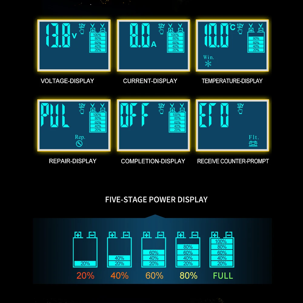 4. Зарядные устройства подходят для большинства типов батарей, включая кальций, гель и AGM, влажные батареи. Они также могут помочь восстановить сливные и сульфированные батареи.
