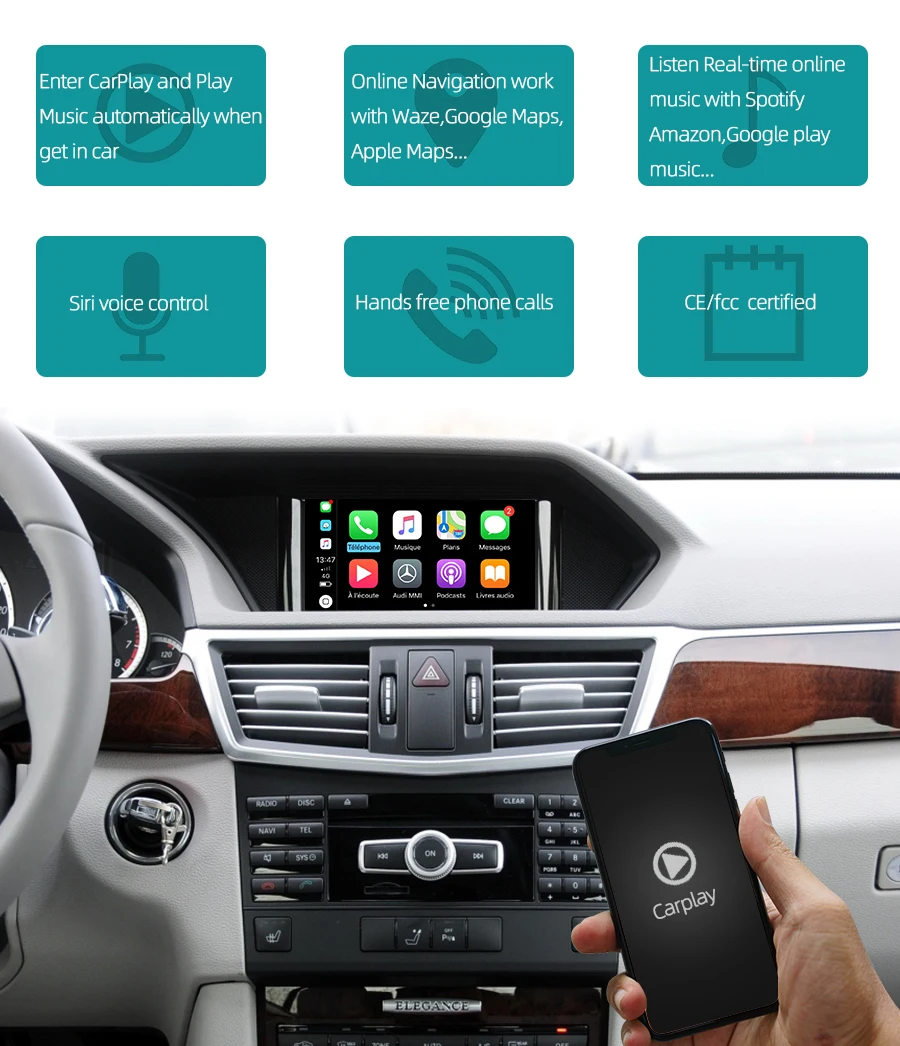 >>>>Support System<<<< 2010-2014 Mercedes A B C E G GL ML SLK Class NTG 4.5/4.7 Functions 1* Iphone Mobile: Cable + wireless CarPlay with automatically function switch 2* Iphone Mobile: Video playback 3* Android with CarLife 4* Android mobile: Video playback + Reverse control on mobile phone + Mirror mobile with automatically screen off 5* Playing USB lossless music with using Carplay navigation 6* USB HD video playback + lossless music playback 7* AHD HD smart track Rear video /AHD HD smart right blinded area video /AHD HD front view video /AHD panorama video/original ODM Rear view video/original factory 360/ original factory right blinded area video/ HD input of DVR Purchase order You have confirmed that the car information has activated AUX