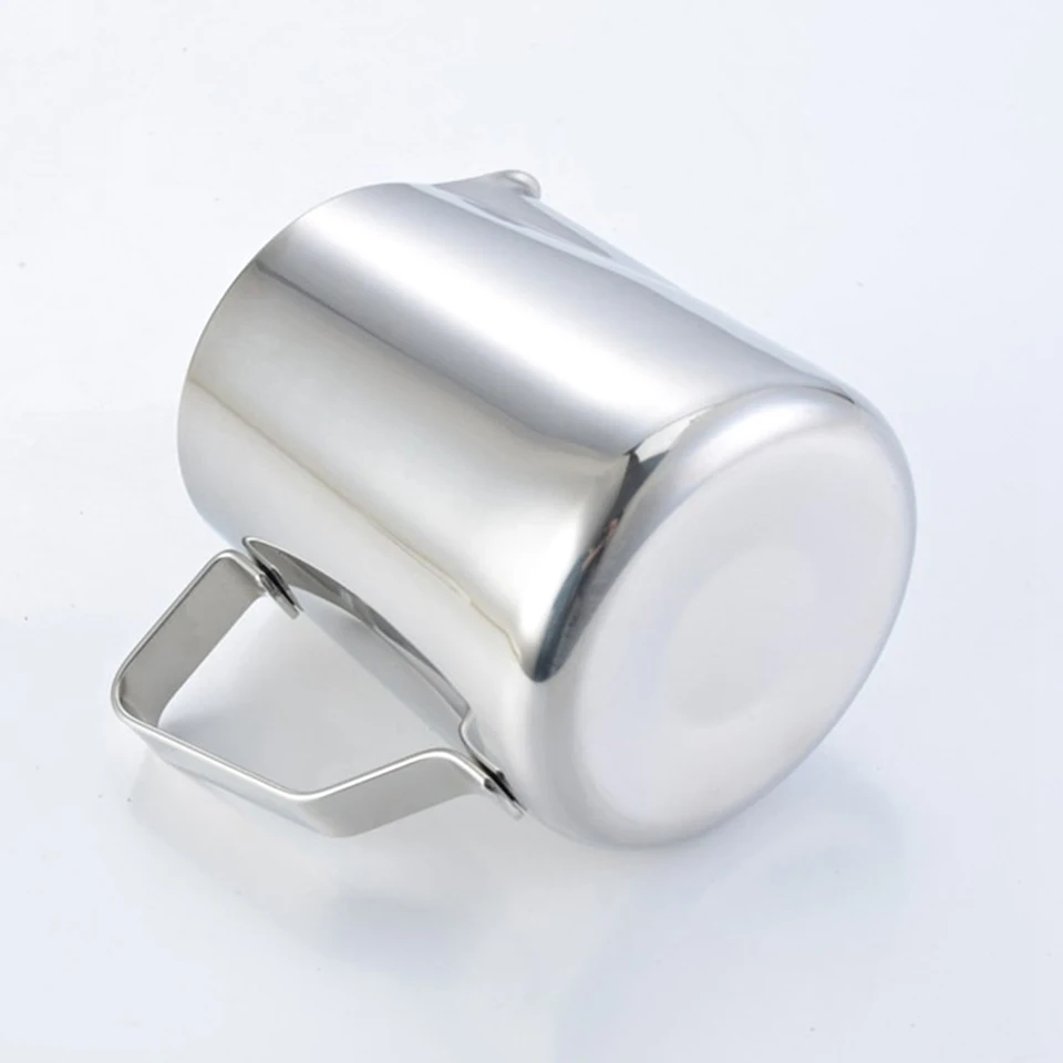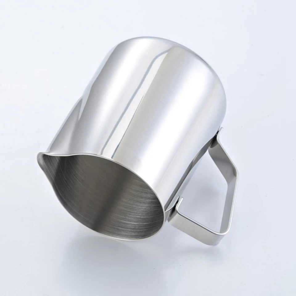 Hand-held frothing milk pitcher prevents you from being scalded. Round stainless steel bottom makes it easy to wash without stain to hide; Curve pour spout easily separates froth from liquid, helps you create personal but perfect latte art for your espressos, cappuccinos for your children and your guest