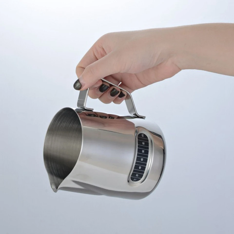 This frothing pitcher with capacity of 12oz / 350ml is great to used at home or office for you and a couple of friends. Measurement inside makes it easy to read, and helps you control how much milk or cream each cup of coffee or espresso needs