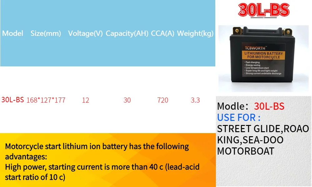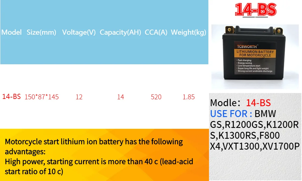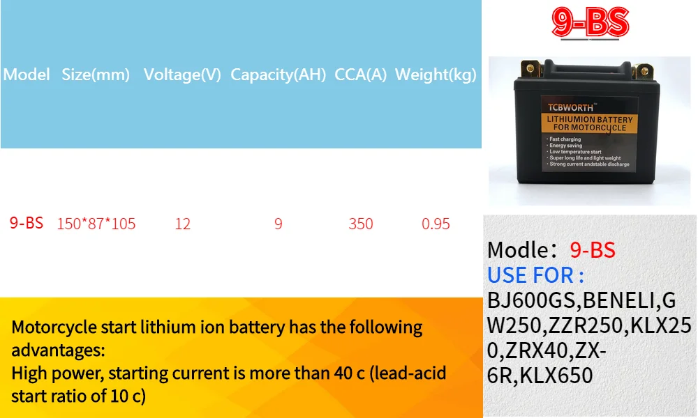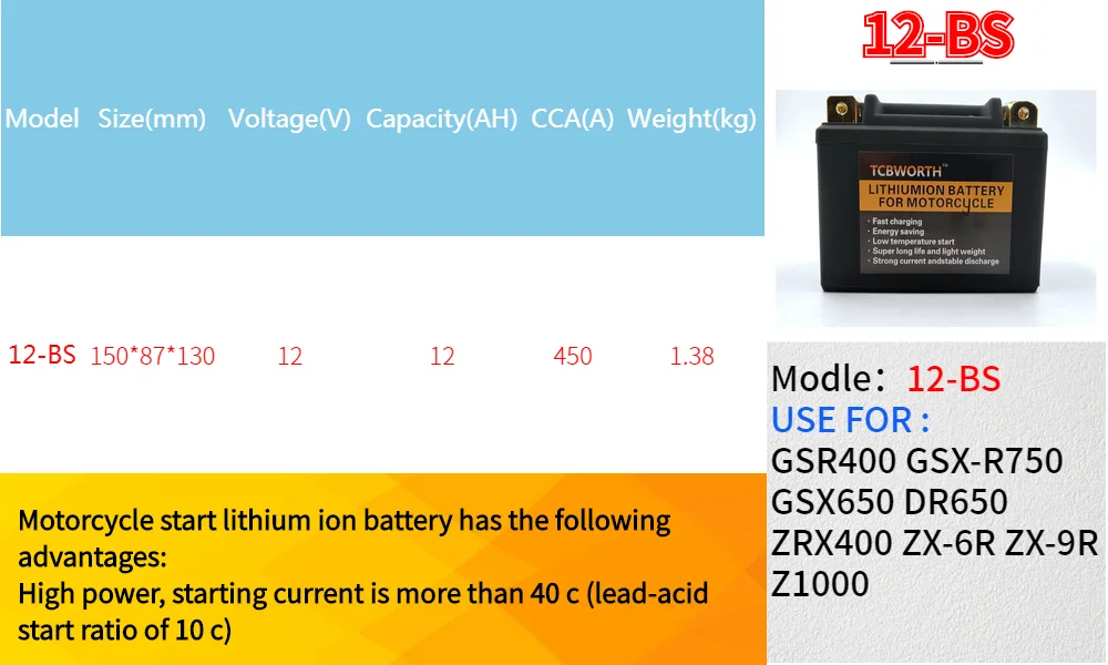Номер модели: 12A-BS и 12-BS Емкость: 8 Ач CCA: 450A Размер: 12A-BS 150*87*105 мм 1,4 кг 12-BS 150*87*130 мм 1,5 кг Максимальное напряжение защиты: 14,6 в Конечное напряжение: 8 в Сертификат: CE ROHS MSDS UN38.3 Высококачественные детали/аксессуары: класс А Плата защиты напряжения (BMS): Да Срок службы: более 2000 циклов Использование для: 12A-BS: Используется для: GSR400, GSX-R750, GSX650, ZRX400, ZX-6R,ZX-9R, Z1000 и т. Д. 12-BS: Используется для: GSR400 GSX-R750 GSX650 DR650 ZRX400 ZX-6R ZX-9R Z1000 и т. Д. Направление положительного и отрицательного электрода: L отрицательное положительное оставлено отрицательное и правое положительное, L положительное отрицательное оставлено положительное и правое отрицательное Преимущества: он имеет отличную безопасность и высокую эффективность и стабильность производительности, чем традиционные свинцово-кислотные батареи Светильник вес: это только в том случае, 1/3 раз светильник er, чем свинцово-кислотных аккумуляторных батарей. Низкий уровень саморазряда: он может храниться более 1 года (и нормальная свинцовая кислота может храниться только менее 6 месяцев). Отсутствие загрязнения: он не содержит каких-либо опасных материалов, таких как тяжелые металлы, кислоты или любые провода и т. Д. Отличная большая производительность зарядки: он может принимать ток зарядки 10C и 90% будет заряжаться за 6 минут. Экономия топлива: увеличение входного напряжения, повышение эффективности свечей зажигания, что позволяет экономить топливо для ваших автомобилей Длительный срок службы: как правило, срок службы нашей батареи может достигать более 2000 раз с емкостью 80% (свинцово-кислотная батарея noral имеет срок службы всего в 300 раз). Внимание: перед установкой проверьте правильность выпрямителя. Литиево-ионный аккумулятор для мотоцикла имеет следующие преимущества: 1) светильник вес, запуска для традиционных свинцово-кислотная батарея Вес около одной трети; 2) Экологическая защита, отсутствие серной кислоты, тяжелых металлов, таких как свинец, кадмий и ртутное загрязнение; 3) не нужно добавлять кислоту, полностью бесплатное обслуживание, отсутствие проблемы с утечкой кислоты, может быть установлен в любом направлении для использования, безопасный и надежный; 4) Высокая мощность, пусковой ток составляет более 40 с (отношение начала свинцово-кислотного пуска 10 с); 5) ЗАРЯДНАЯ способность сильна, может быть большой ток быстрой зарядки, самый быстрый может зарядить аккумулятор 10 с, 6 минут можно зарядить до 90% емкости. Даже после потери электричества, можно заполнить в течение короткого времени. 6) сверхдлительный срок службы, может быть больше 2000 раз (свинцово-кислотная батарея обычно 300); 7) Низкий саморазряд, длительное время хранения и может быть более 1 года. 8) стабильное напряжение разряда, двигатель работает более стабильно и проще, чтобы начать ваш мотоцикл.