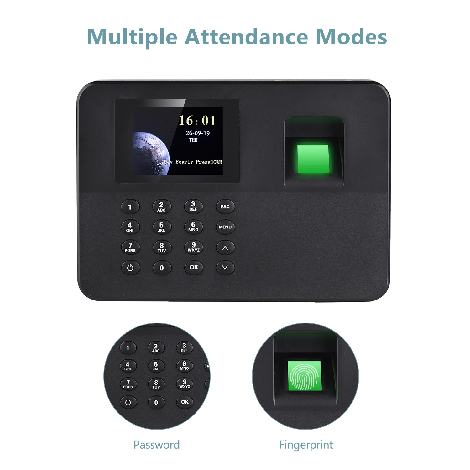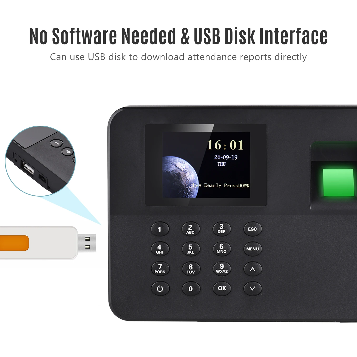 Не требуется программное обеспечение и интерфейс usb-диска: не нужно устанавливать программное обеспечение, легко управлять машиной посещаемости. Можно использовать usb-диск для загрузки отчетов о посещаемости напрямую.