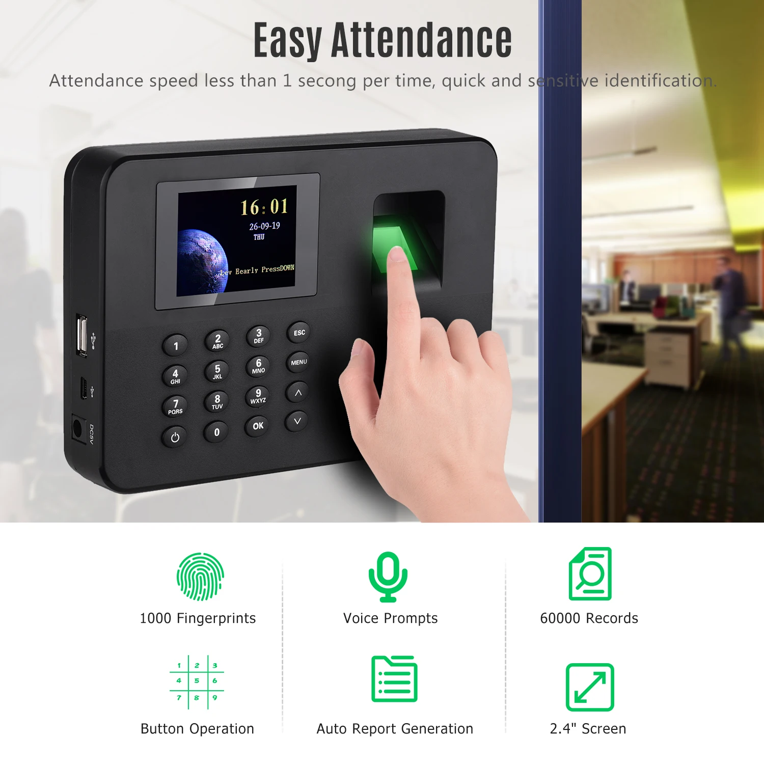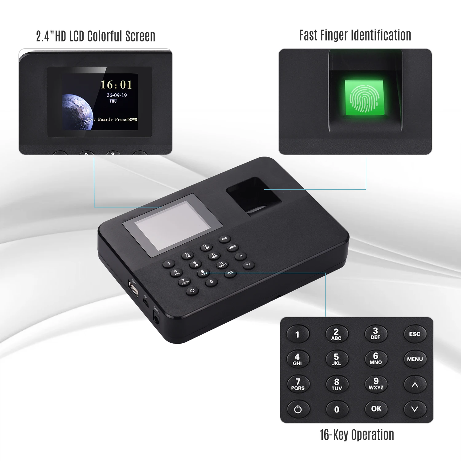 Большая Емкость: 1000 шт отпечатков пальцев и 160000 записей; Поддержка Режима аутентификации отпечатков пальцев и паролей, скорость посещаемости составляет менее 1 секунды за раз, быстрая и чувствительная идентификация.