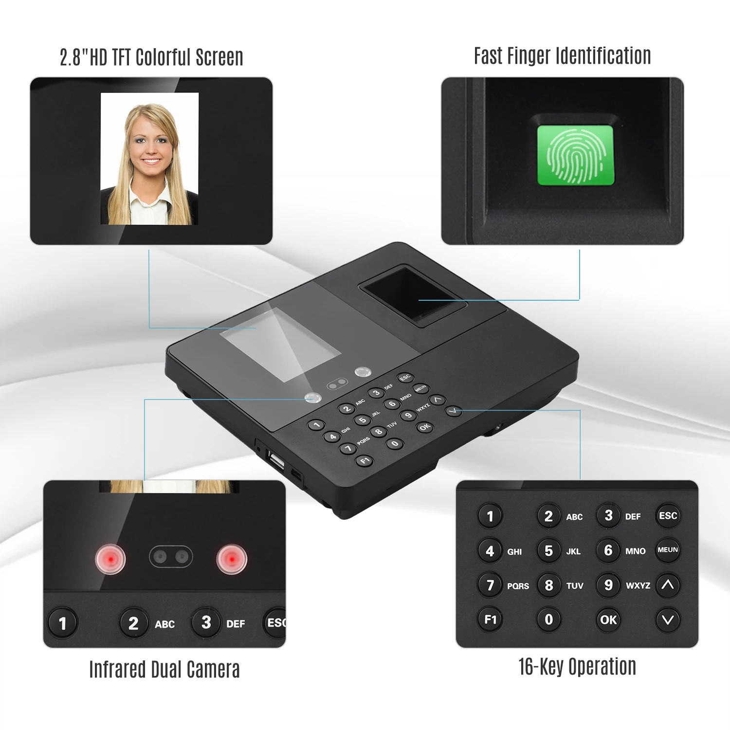 Высокая емкость и 3 режима посещаемости: Поддержка режима проверки подлинности лица, отпечатков пальцев и паролей, 300 лиц, 3000 отпечатков пальцев и 160000 записей.