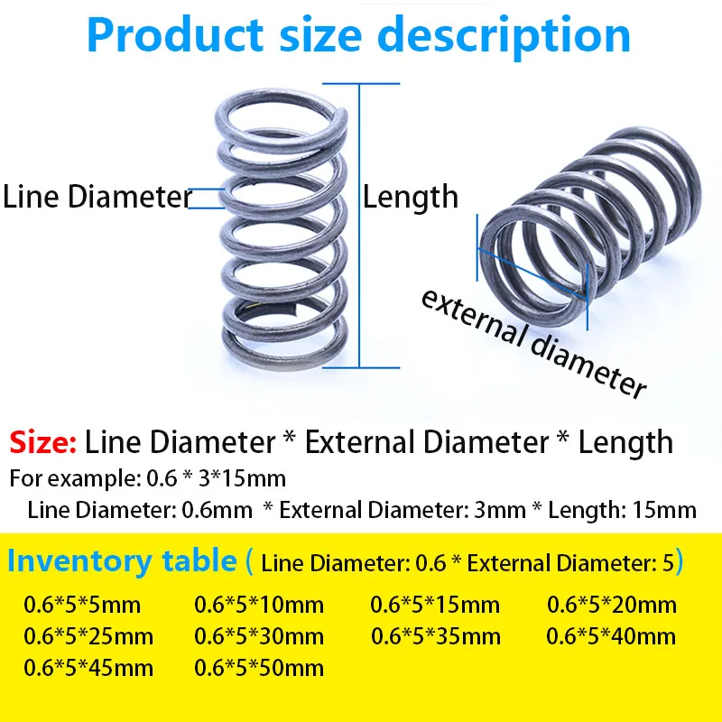 Наименование товара: сжатая пружина Материал изделия: 65Mn Обработка поверхности: темно-синий Размер: диаметр линии (0,6 мм), Внешний диаметр (5Мм), длина (5-50 мм) Количество: 10 шт. Продукт Особенности: Пружина сжатия сделана из высококачественной 65 мн пружинной стали. Устойчивость к коррозии, высокая термостойкость, высокая прочность, высокая прочность, отсутствие деформации. Форма размера: диаметр линии * Внешний диаметр * длина Например: 1,0*5*15 мм (Диаметр Лески: 1,0 мм * Длина: 5 мм * Внешний диаметр: 15 мм) Примечание: 1.Размер товаров в нашем магазине измеряется вручную, и данные немного не указаны. 2.Наш магазин поддерживает различные пользовательские весенние бизнес, в том числе Натяжные Пружинные пружины давления пагода Весна кручение весна все виды специальной формы пружина. Фото продукта