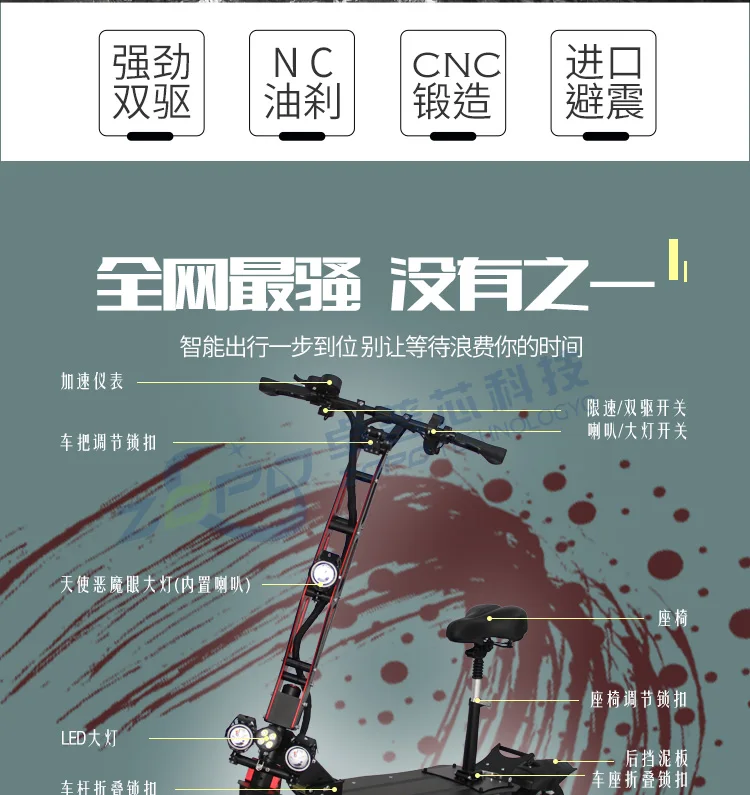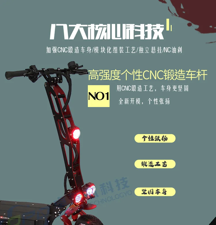 Режим привода: двойной привод Тип двигателя: бесщеточный мотор Холла Мощность двигателя: 2800 Вт * 2 Максимальная скорость: 80 км/ч Напряжение контроллера: 60 в Ограничительный ток контроллера: 37A Тормозная система: АБС электромагнитный Масляный тормоз Тормозная колодка: диск 160 мм Передняя подвеска: подвеска типа C Задняя подвеска: независимая подвеска Максимальная нагрузка: 180 кг Сиденье: стандартное сиденье * 1 Шины: 90/60-6,5 CST (внедорожные шины, дорожные шины на выбор)