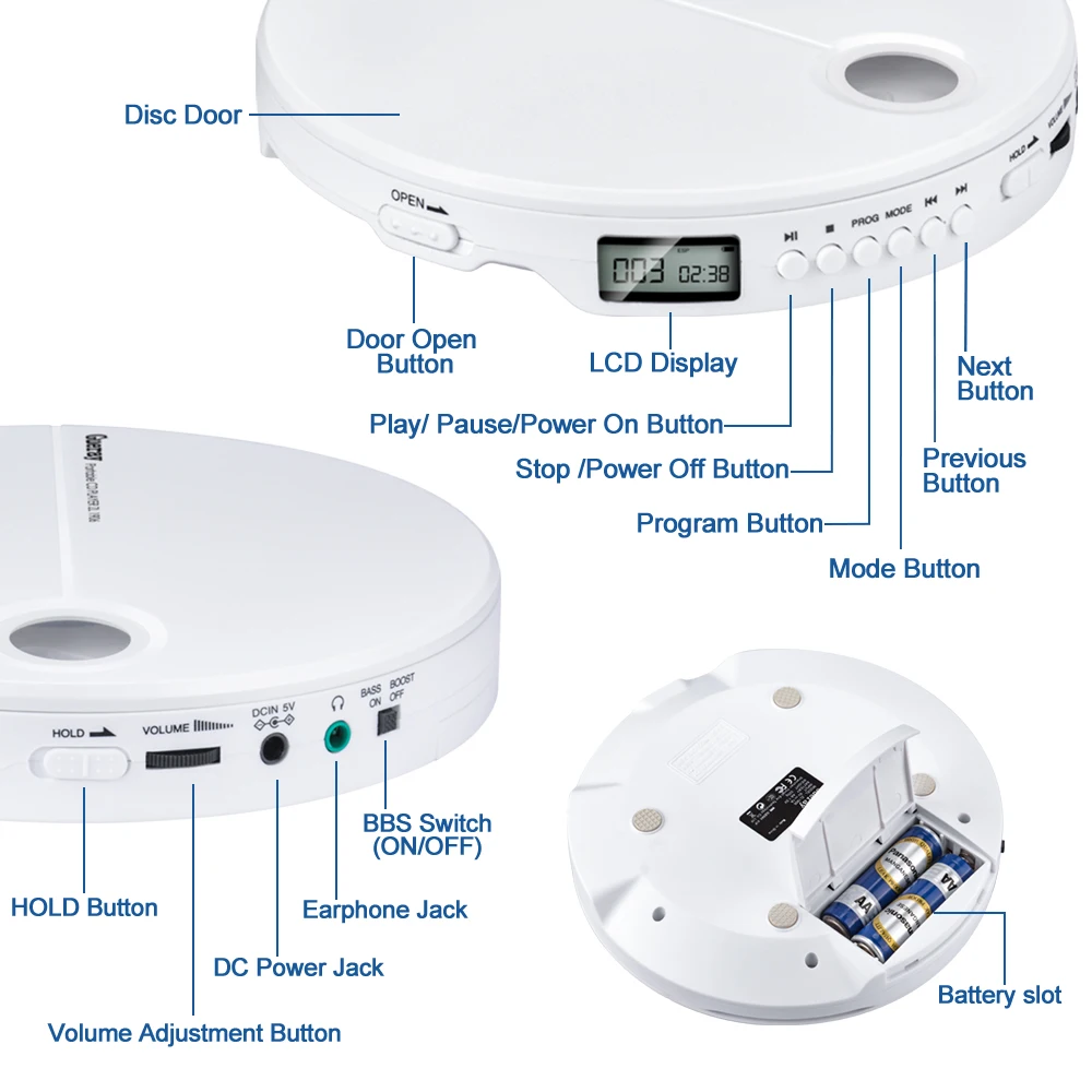 ❤[Качество звука hifi без потерь и многофункциональность] CD-плеер обладает различными современными функциями. ASP: система anti-shock для предотвращения прерывания воспроизведения CD в чехол вибрации; Реж: все файлы можно воспроизводить обратно многократно для mp3; Звуковой эффект BBS; 4 режима воспроизведения: повторите трек, повторите все, запрограммируйте игру, играйте в случайном порядке