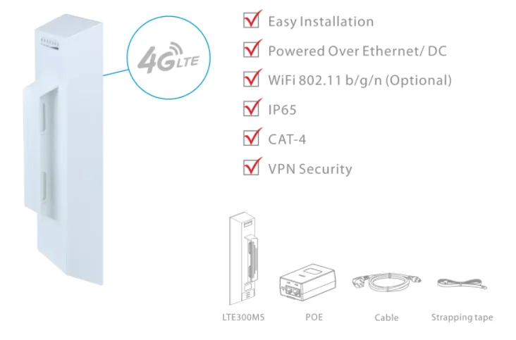 Особенности: LTE300M5-высокопроизводительный маршрутизатор 4G LTE. LTE300M5 идеально подходит для любых ситуаций, когда необходима беспроводная сеть или где обычный доступ в Интернет недоступен. Предназначен для Жилой и SOHO/SMB потребители, LTE300M5 обеспечивает многосервисный пользовательский опыт, предоставляет расширенные услуги передачи данных и мобильный сервис Устойчивость в одном растворе.