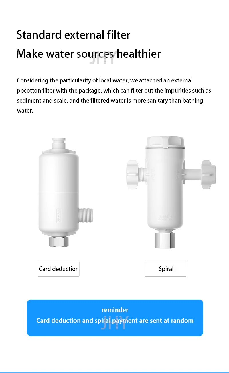 Стандартный внешний фильтрСделайте источники воды более здоровымиУчитывая особенность местной воды, мы прикрепили к посылка внешний фильтр ppcotton, который может отфильтроватьПримеси, такие как осадок и накипь, а фильтрованная вода более гигиенична, чем вода для купания.