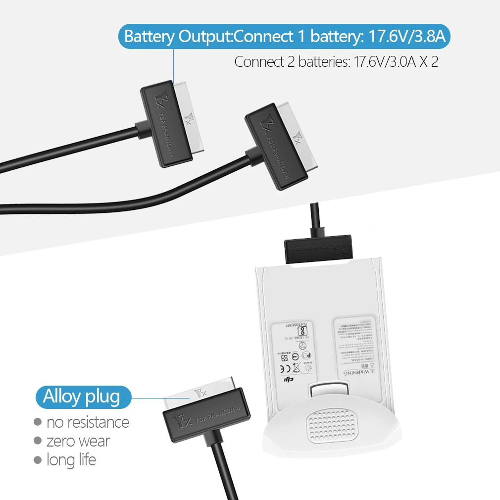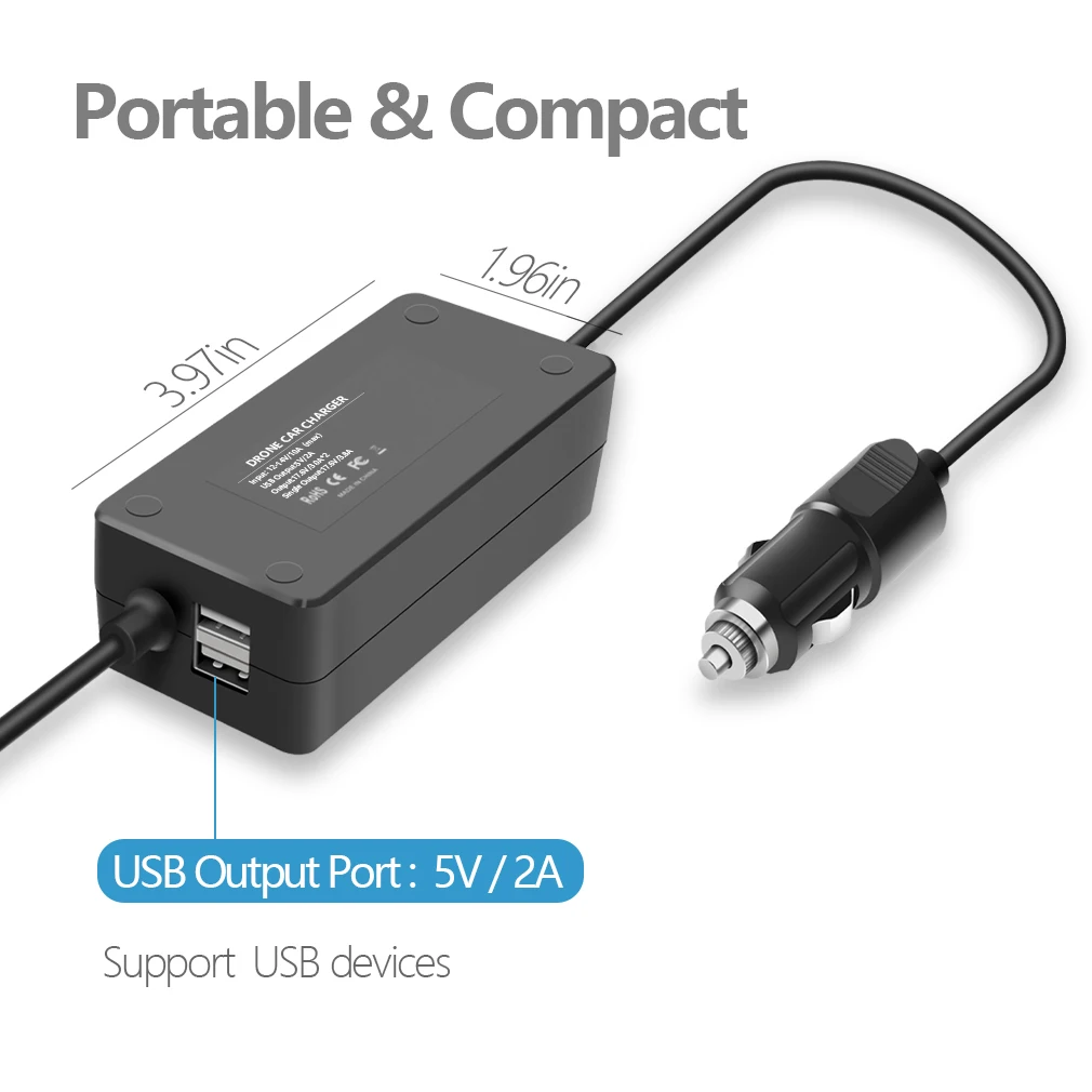 Автомобильное зарядное устройство 3 в 1, специально разработанное для аккумуляторов и передатчиков дрона DJI Phantom 4 серии RC, используется для зарядки интеллектуальных летных батарей Phantom 4 и дистанционного управления через порт прикуривателя автомобиля, можно заряжать 2 батареи и пульт дистанционного управления одновременно