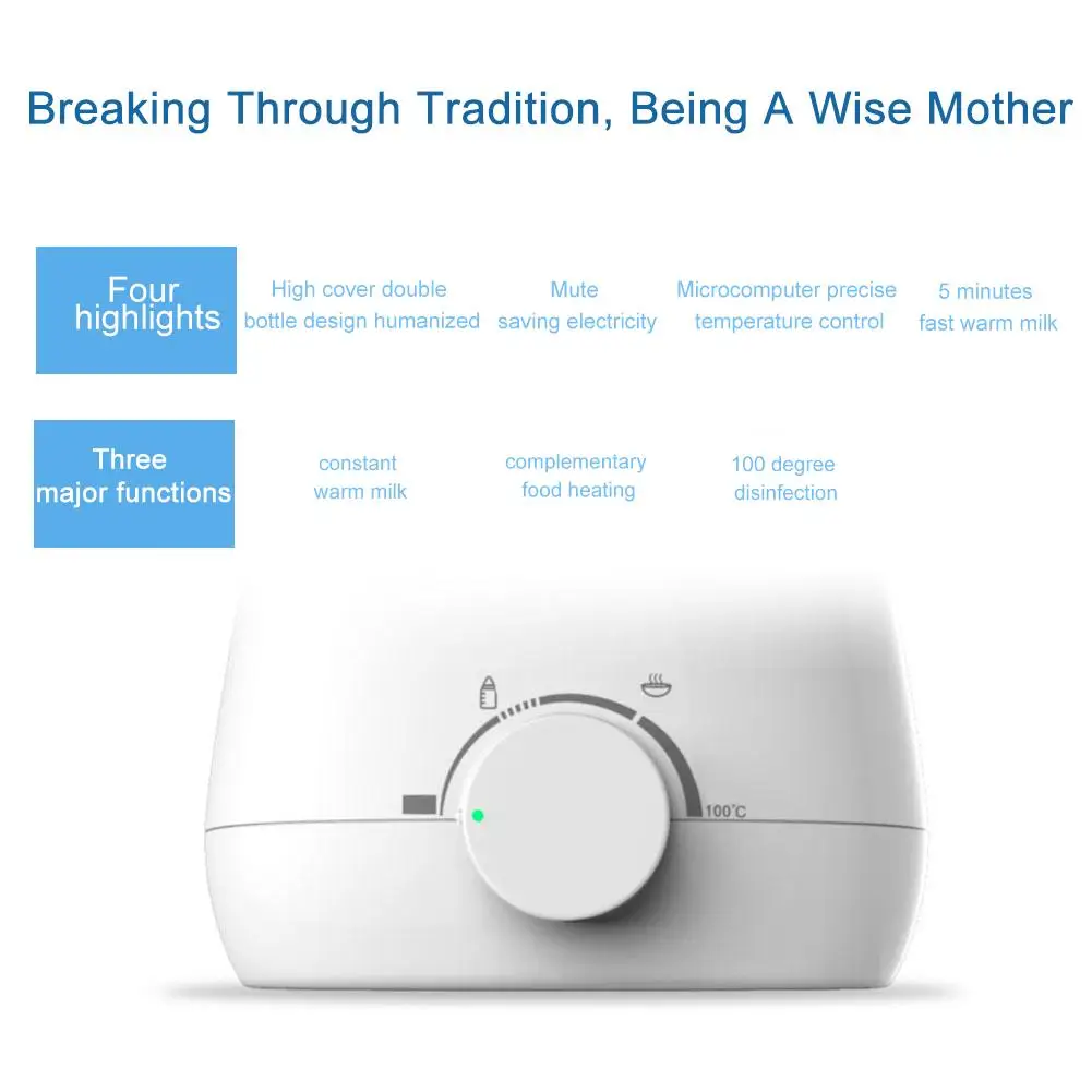 Четыре основные характеристики: 5 Минут Быстрого теплого молока; микрокомпьютер точный контроль температуры; высокая крышка двойная бутылка дизайн гуманно; Бесшумная экономия электричества.