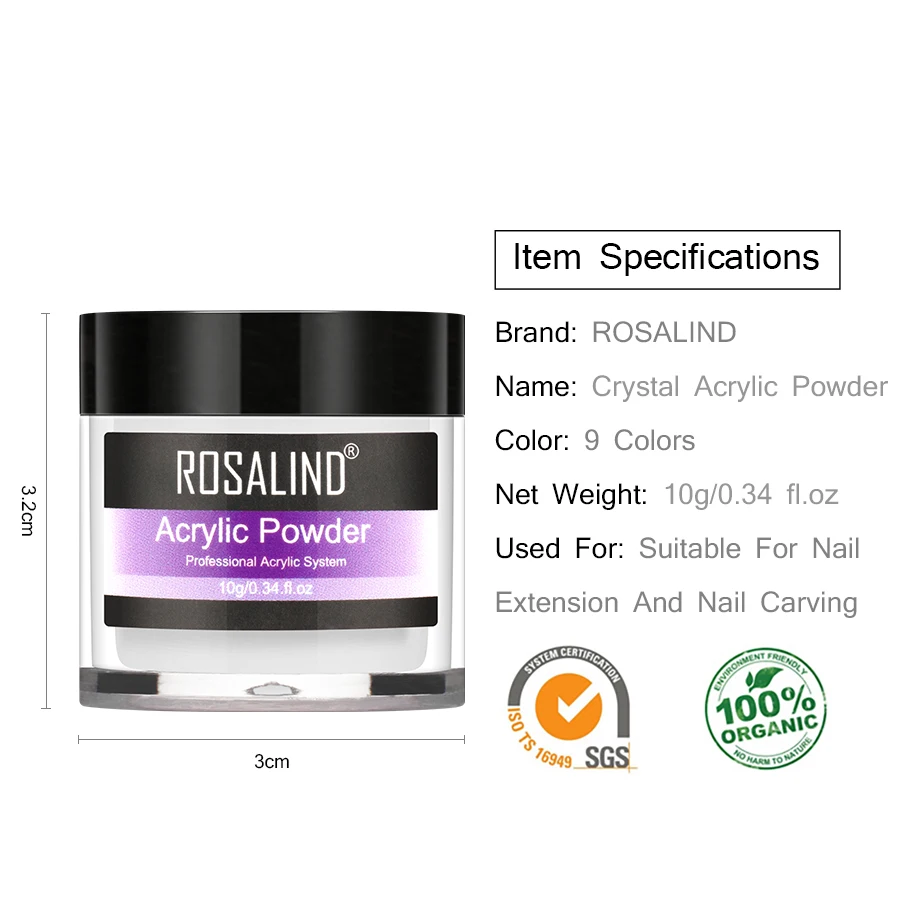 ROSALIND акриловая пудра, Кристальный дизайн ногтей, советы по конструированию, прозрачный акриловый порошок для ногтей, маникюр, 10 г розовый, белый, прозрачный