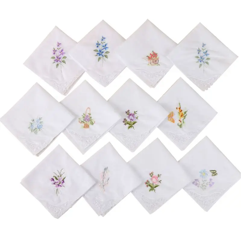 Квадратные женские носовые платки, базовый белый цвет, Цветочная вышивка и специальные бабочки кружева на углу, элегантный и красивый.