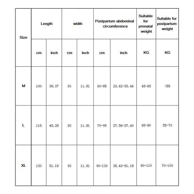 Размер (см):M код: длина 100 см ширина 30 см Окружность послеродового живота 60-85 см подходит для веса: предродовая 90-130 кг Послеродовая 110 кг/л код: длина 115 см в ширину 30 см в послеродовой период окружность живота 70-95 см подходит для веса: 130-160 кг в послеродовой период 110-140 кг/XL код: длина 130 см ширина 30 см Окружность послеродового живота 90-130 см подходит для веса: Пренатальная 160-220 кг Послеродовая 140-200 кг