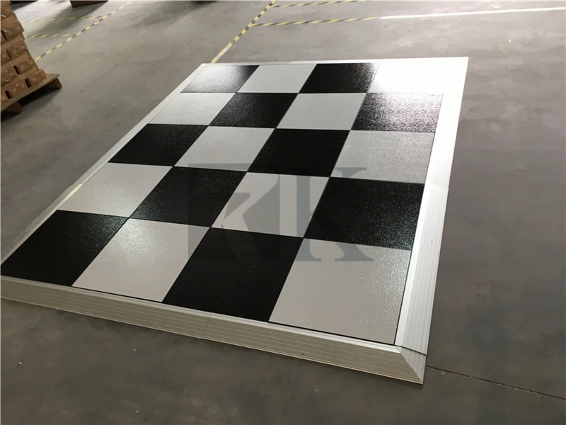 RK Plastic Dance Floor with PVC Surface,Black & White & Wood Grain. Widely used for event,party,wedding,any indoor or out door function. Flooring panel with interlocked system,without any hole or joints on the surface. Can be easy install at the same time.For example,a 5m*5m dance flooring can be build during 15 minutes. PVC surface is water resistant and flame resistant. It is a perfect idea for using indoor or outdoor party. Most specially of the dance flooring is the lock system.The connector can be assembled on the back side of the panel. Saving more space for storage. Edge of flooring comes from light weight,non-slip aluminum ramp.