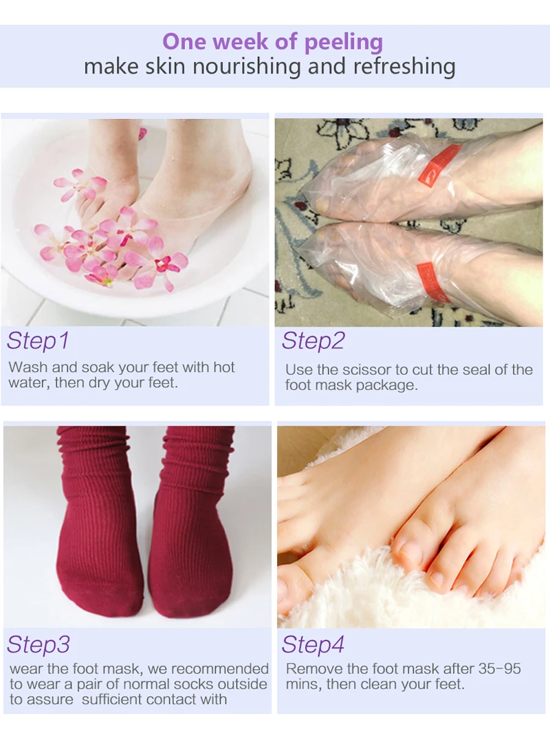 5. Большинство начинают снимать омертвевшую кожу после 48 часов использования, но из-за разных типов кожи может понадобиться 2-3 пары, пожалуйста, используйте маску для ног снова через 48 часов.