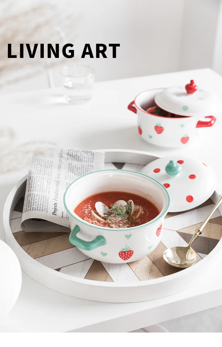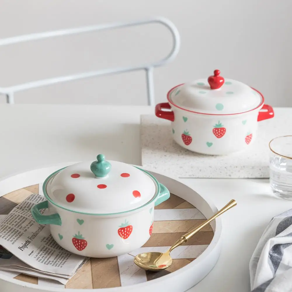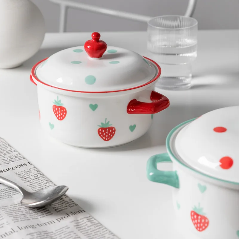 Отзывы о Креативная керамическая миска с клубничным узором двумя ручками и крышкой 700 мл