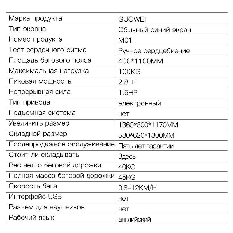 Беговая дорожка GUOWEI M01, дополнительно можно укомплектовать вибромассажером. Вибромассажер. Перед тренировкой мышцы нужно обязательно разогреть, а после – снять усталость. Вибромассаж является хорошим средством, поддерживающим общий тонус мышц. Женщинам также стоит обратить внимание на эффективность вибромассажа в борьбе с целлюлитом. - Назначение: домашнее - Тип: электрическая - Скорость: 0,8 - 12 км/ч - Двигатель: 1.5 л.с. (постоянный ток) - Пиковая мощность двигателя: 2,8 л.с. - Размер бегового полотна: 110*40 см. - Регулировка угла наклона: нет - Измерение пульса: сенсорные датчики - Консоль: черно-белый LED дисплей - Показания консоли: скорость, время, расстояние, калории, пульс - Кол-во программ: 10 - Размер в сложенном виде (Д*Ш*В): 53*62*130 см - Размер в рабочем состоянии (Д*Ш*В): 136*62*117 см - Вес нетто: 40 кг - Макс. вес пользователя: 100 кг - Гарантия 1 год.
