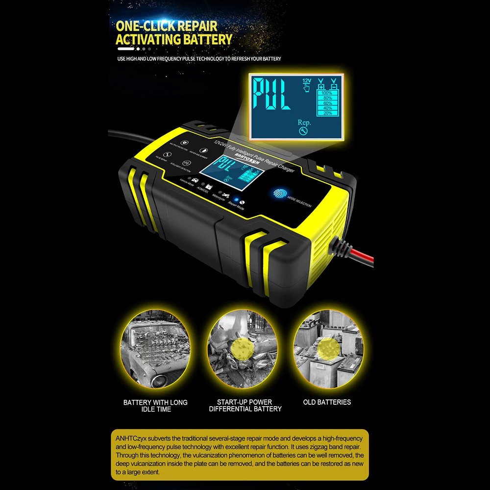 4. Зарядные устройства подходят для большинства типов батарей, включая кальций, гель и AGM, влажные батареи. Они также могут помочь восстановить сливные и сульфированные батареи.