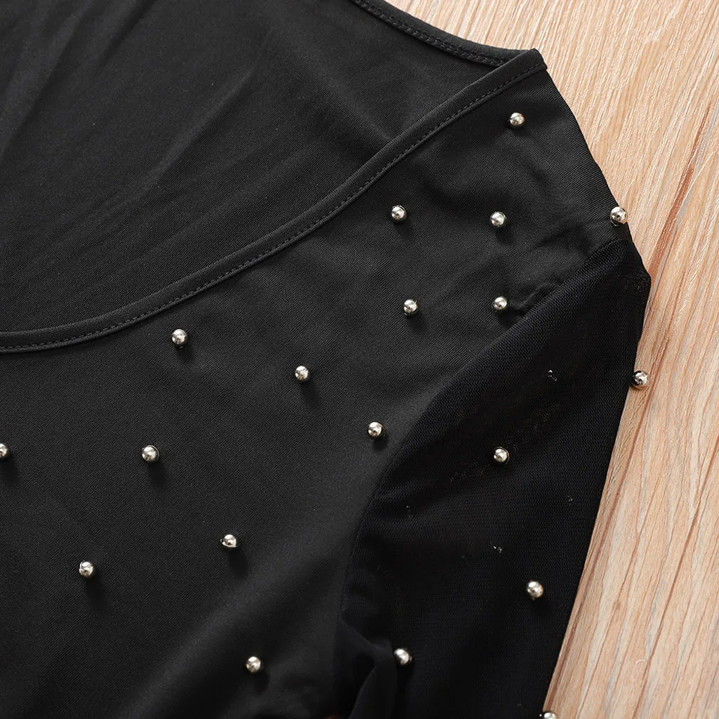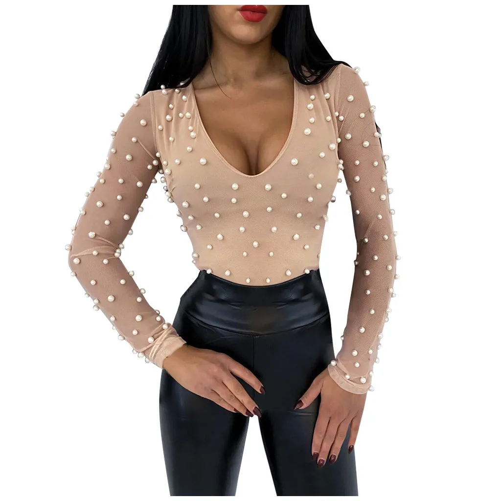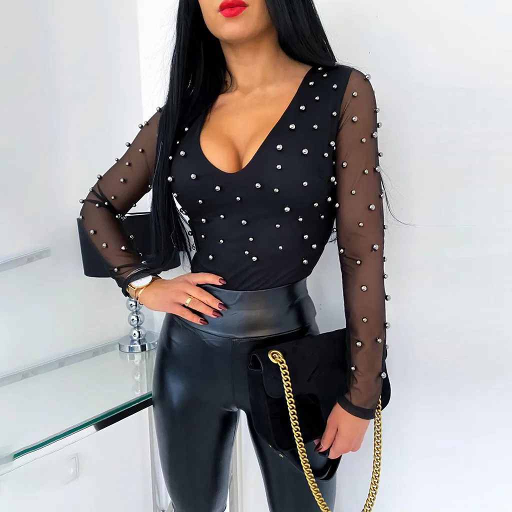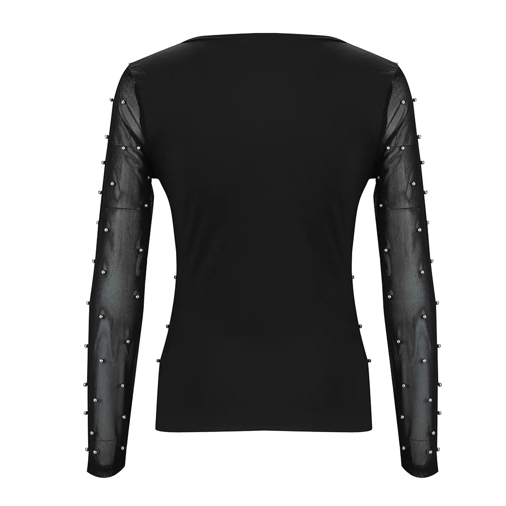 Летняя женская тонкая футболка, женская сексуальная блузка с бисером, сетчатая перспектива, с длинным рукавом, с v-образным вырезом, топы, однотонный пуловер, новая футболка