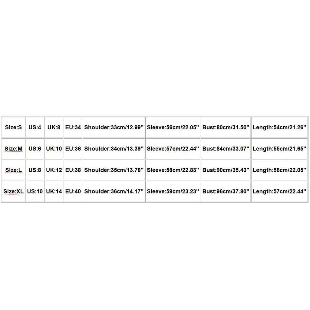 | Размер: S | США: 4 | Великобритания: 8 | ЕС: 34 | Плечо: 33 см/12,99 дюйма | Рукав: 56 см/22,05 дюйма | Обхват груди: 80 см/31,50 дюйма | Длина: 54 см/21,26'' |