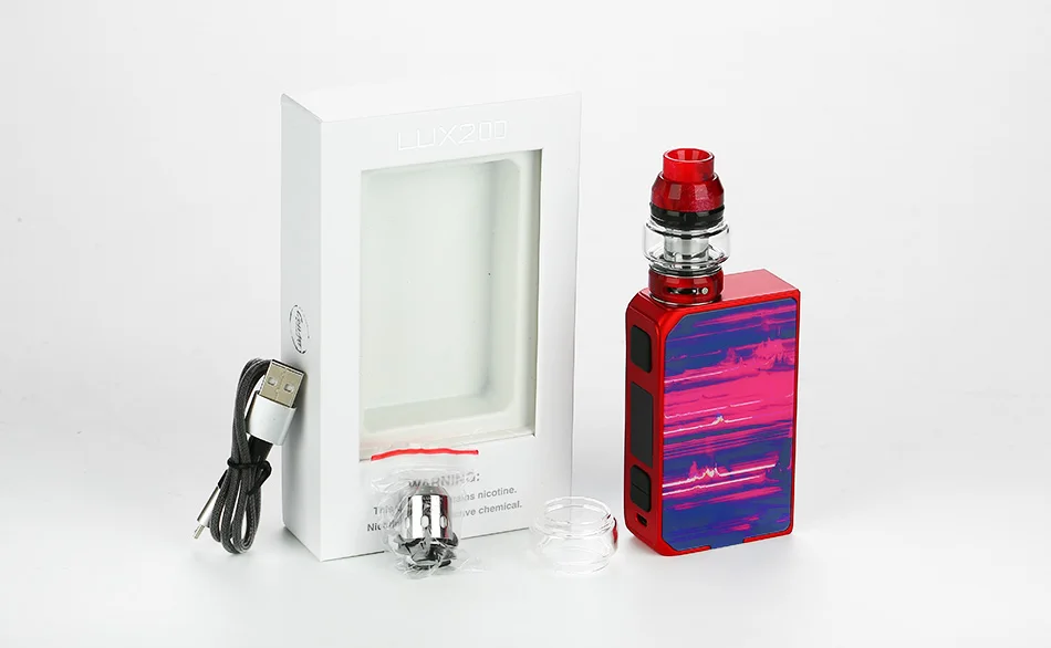 1 x LUX 200 (без ячеек) 1 х LUX сетчатый бак 5,5 мл (предварительно установлена катушка M1) 1 х дополнительная трубка 5,5 мл 1 х дополнительная катушка M4 USB кабель (1 шт.);
