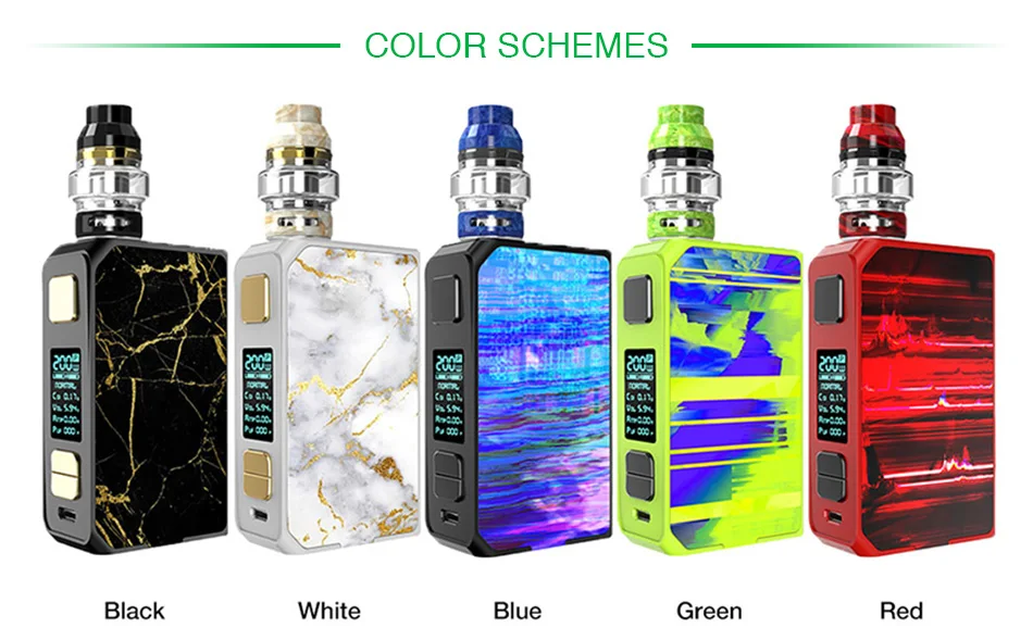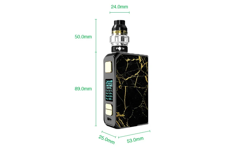 Уникальный мраморный дизайн Двойные батареи 18650 с максимальным выходом 200 Вт Усиленная стеклянная панель с УФ-печатью Особенности саморегулирующийся контакт батареи Усовершенствованный чип EAGLE с поддержкой быстрой скорости стрельбы 0,005 s Несколько защиты и настраиваемый дисплей Сетчатый бак из искусственного мрамора с большой емкостью 5,5 мл Регулируемая система воздушного потока и уникальная сетчатая катушка M1, M4 Верхняя крышка с зажимом для эффективной защиты от утечки