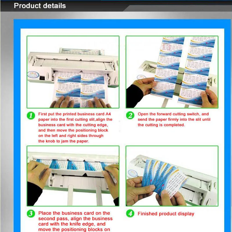 Высокопрочная тонкая электрическая машина для резки визитных карточек автоматическая машина для резки визитных карточек Энергия: электричество Номер модели: 300 Модель: 300 Электрический Резак для визитных карточек Размер визитной карточки: 90*54 мм Напряжение: 220 В, 50 Гц Применимая бумага: размер А4 (L285-297mm * W195-210mm Скорость резки: около 2-3 минут (Вырежьте 100 визиток) Толщина резки: 120-300 г Вес изделия: 3,9-4,2 кг Срок службы: 100 000 раз или более Примечание: Эта машина имеет 220 в, пожалуйста, свяжитесь с нами, если вам нужно 110 В.