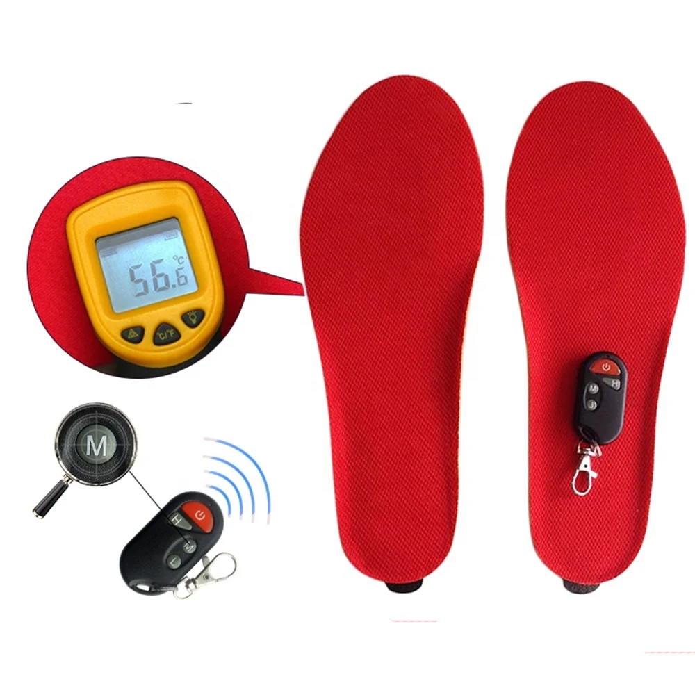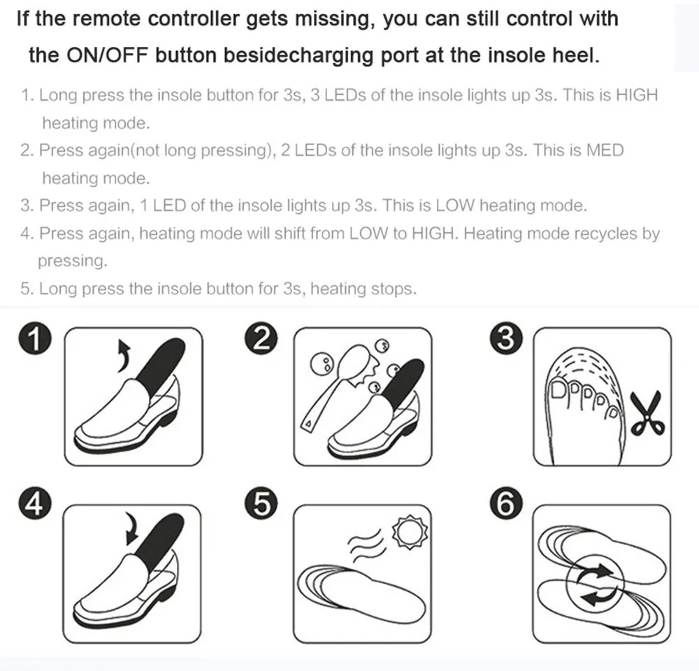 Шаги: ①Cut up-тщательно Отрежьте стельку, чтобы соответствовать размеру обуви, обязательно обрежьте ее в соответствии с рекомендуемой линией, чтобы избежать обрезки электрического провода. ② Полная зарядка аккумулятора с комплектом зарядного устройства. ③ включение-Нажмите кнопку ВКЛ на пульте управления, чтобы включить питание. ④ регулировка температуры-Нажмите кнопку H/M/L на пульте дистанционного управления для регулировки температуры.