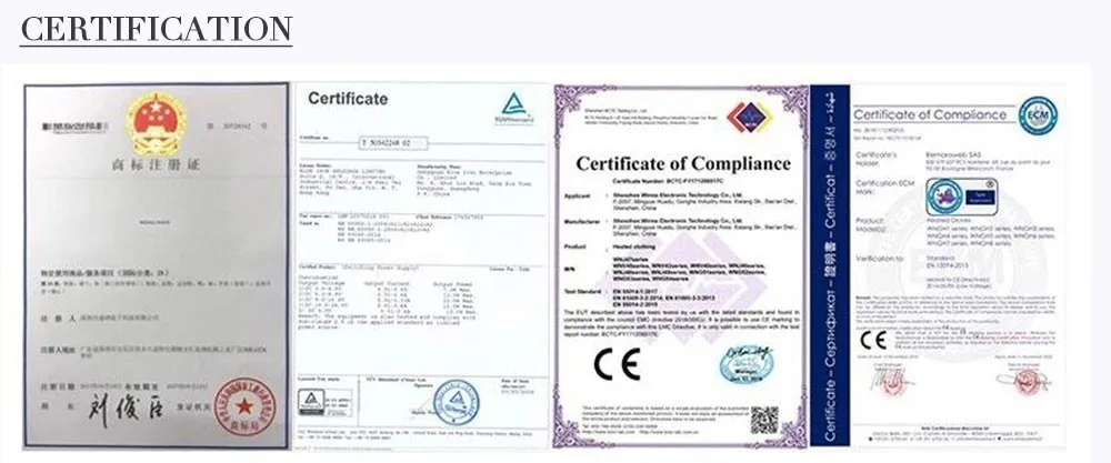 Компания прошла национальный сертификат качества и безопасности ISO9001, и получила сертификацию CE/PSE/UL/ROHS/GS и множество патентных сертификатов, завоевала доверие и поддержку многих клиентов в стране и за рубежом, установила хорошие отношения с клиентами, особенно из России, Украины, Франции, Великобритании, Германии, Польши, Канады, США и другие страны.
