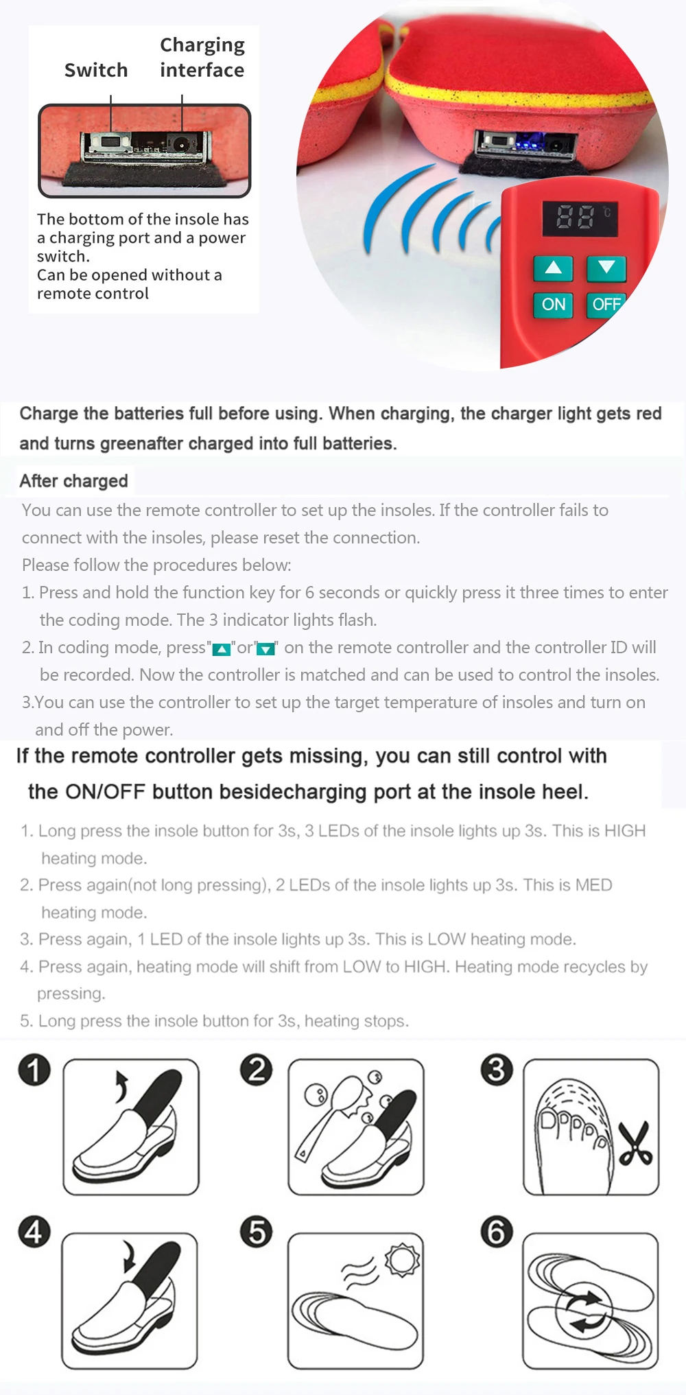 Наши стельки с подогревом предназначены для сохранения тепла ваших ног. Этот инновационный продукт был разработан для вашего комфорта и здоровья. Они отлично подходят для всех на открытом воздухе в холодные зимние месяца, а также для людей с постоянно холодными ногами и плохой циркуляцией. доступный на ручном и дистанционном управлении температуры, он позволяет регулировать температуру в вашей обуви простым щелчком. Никогда больше не замерзнут ноги!