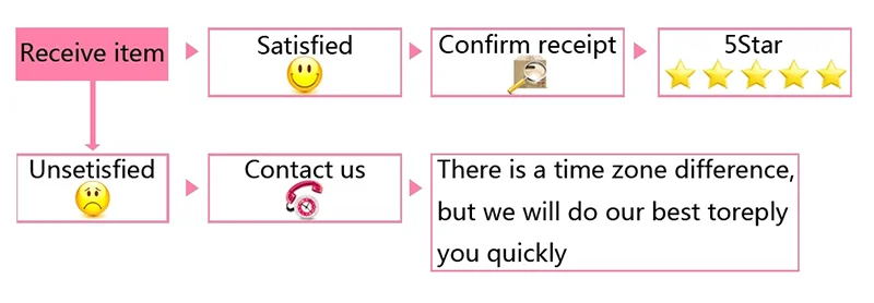 2. Если товары, которые вы получили, были повреждены или неправильные стили, пожалуйста, не оставляйте отрицательных отзывов сначала, пожалуйста, свяжитесь с нами, мы разберемся с этим и найдем лучшие решения, ваше удовлетворение-наше стремление работать еще лучше.