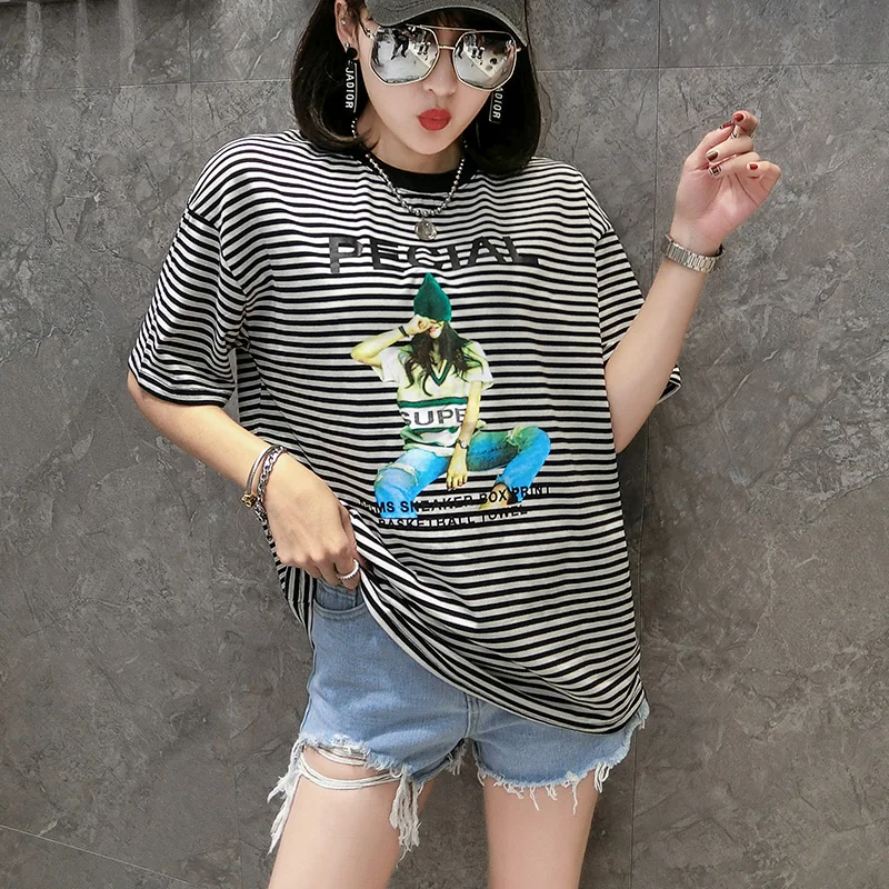 Отзывы о Женская свободная футболка в полоску хлопковая Футболка с принтом Корейском
